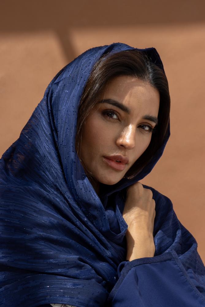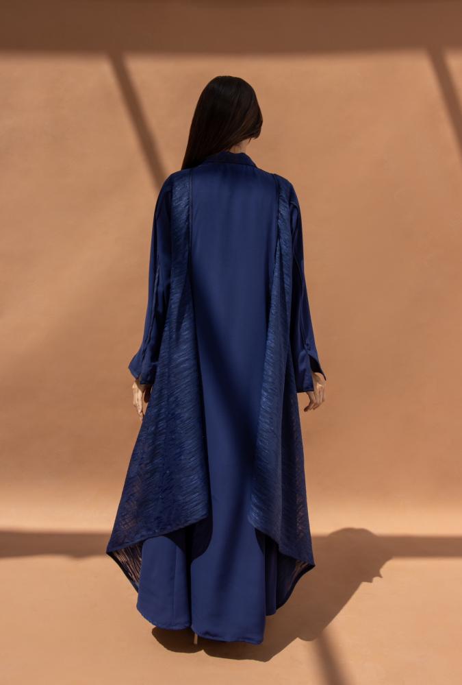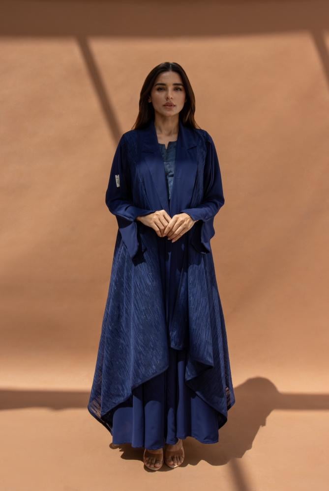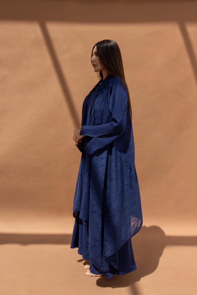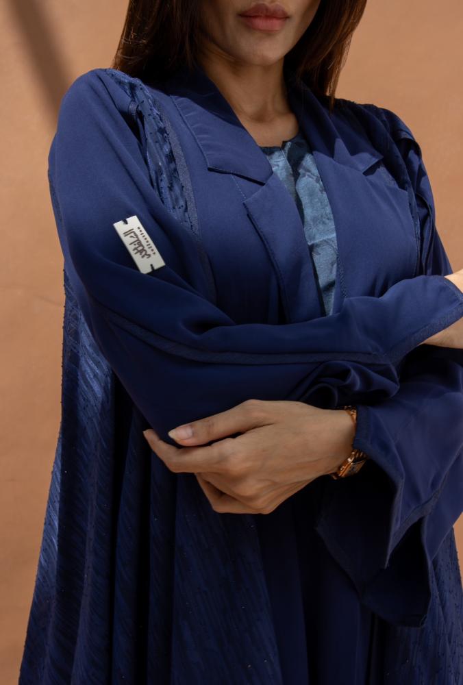 عباية أنيقة مصنوعة من قماش الكريب الفاخر، المعروف بملمسه الناعم وانسيابيته المريحة. تتميز بتزيين راقٍ من الشيفون، الذي يضفي لمسة أنثوية ناعمة وجاذبية خاصة على التصميم.