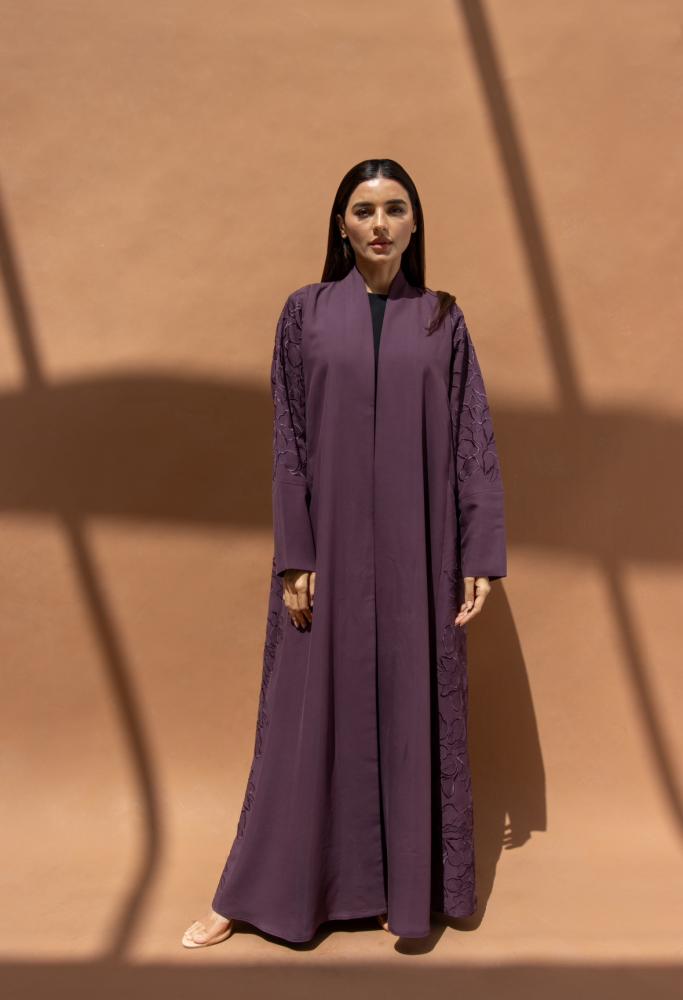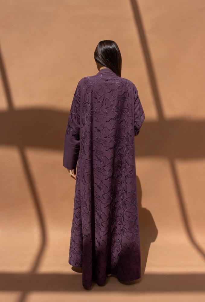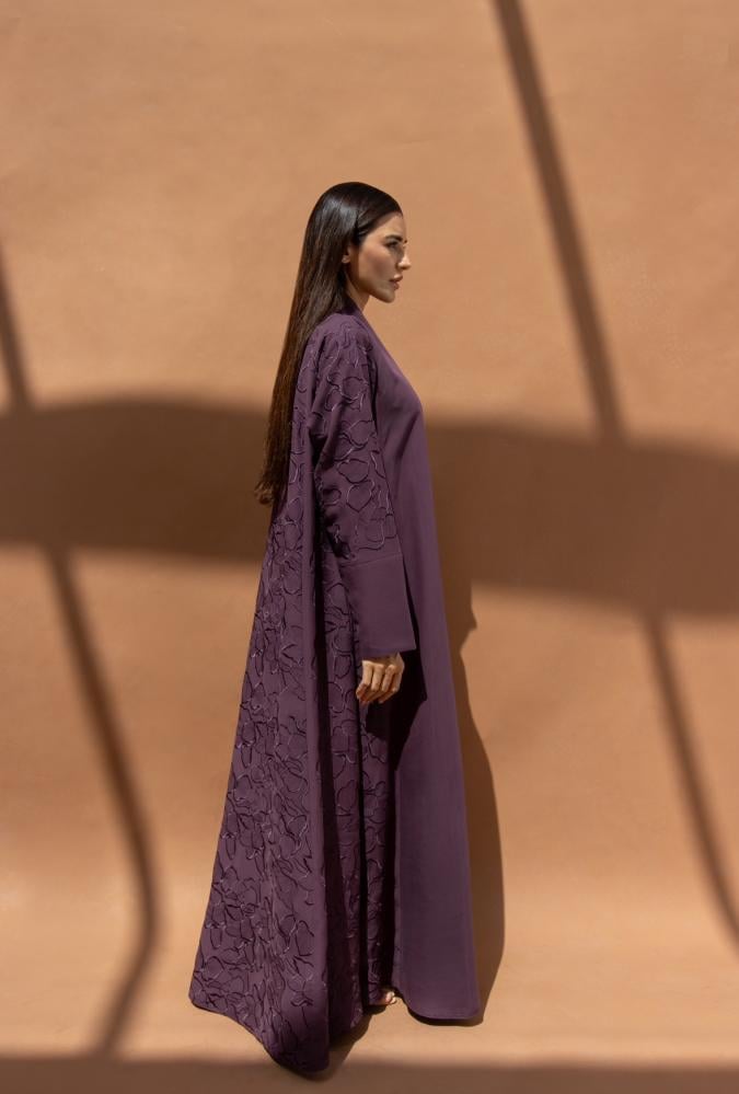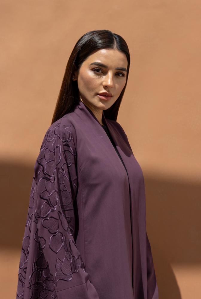 العباية مصنوعة من قماش الكريب الإندونيسي، المعروف بملمسه الناعم وانسيابيته الأنيقة، مما يمنحها راحة وسهولة في الارتداء. تتميز بتطريز كامل بالورود يغطي العباية والطرحة، ما يضفي عليها لمسة فخمة وأنثوية راقية.