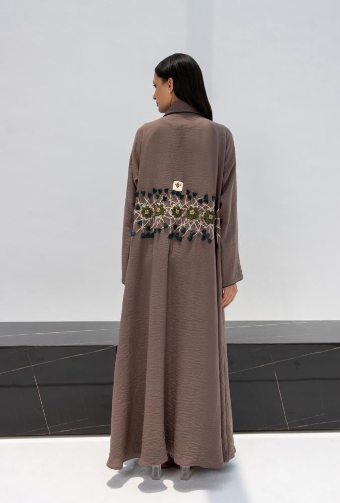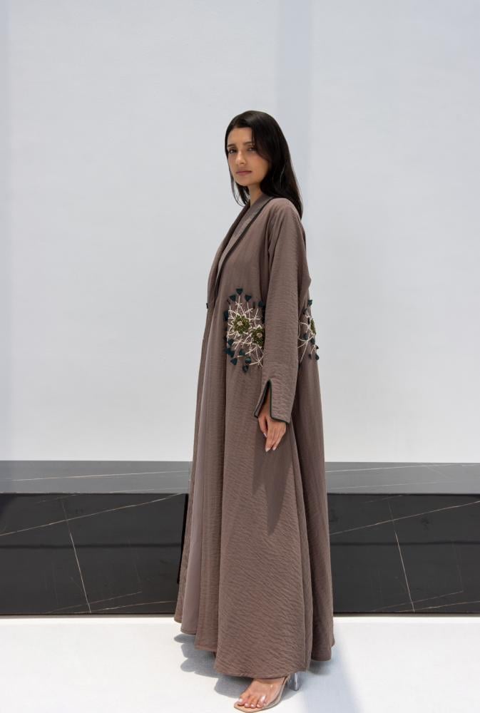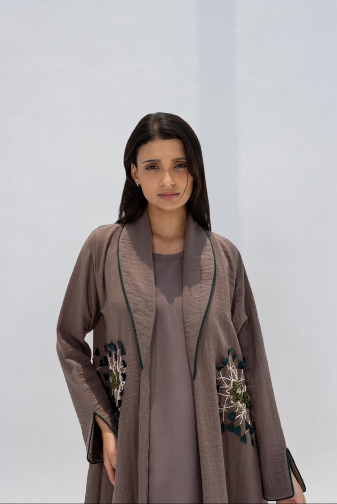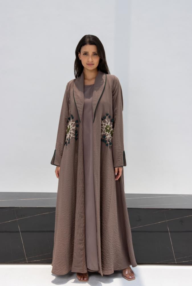 القماش: لينن قطن مطرز يدويا باللون الزيتي.. مع طرحه شيفون طبيعي