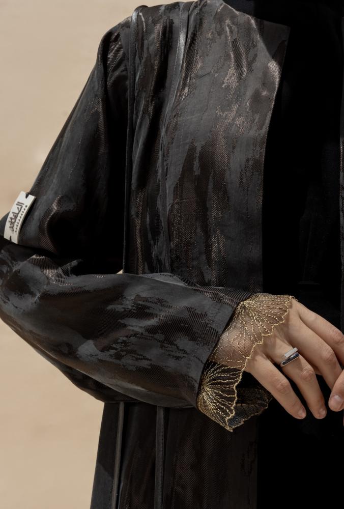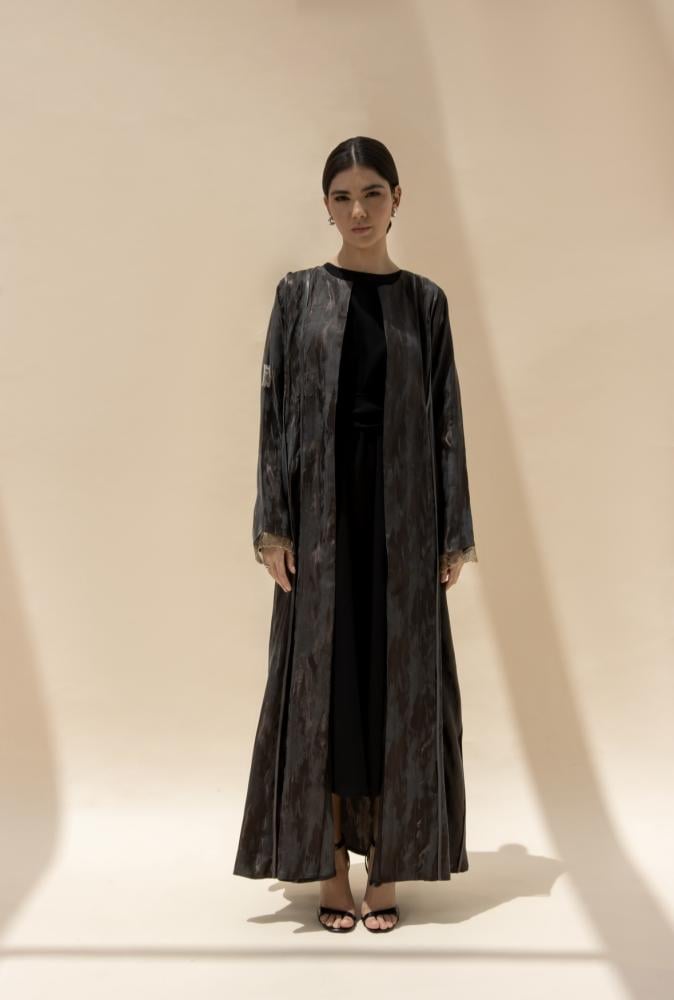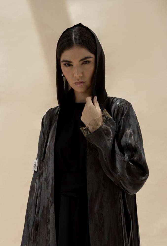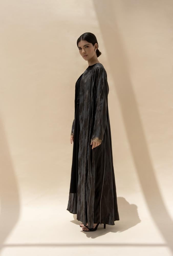 عباية أنيقة مصنوعة من الحرير المغسول. تأتي بتصميم كلوش واسع يمنح حرية في الحركة ولمسة راقية. الأكمام مزينة بالدانتيل الناعم، مما يضيف لمسة أنثوية أنيقة للتصميم. تناسب الإطلالات الفخمة والمناسبات،