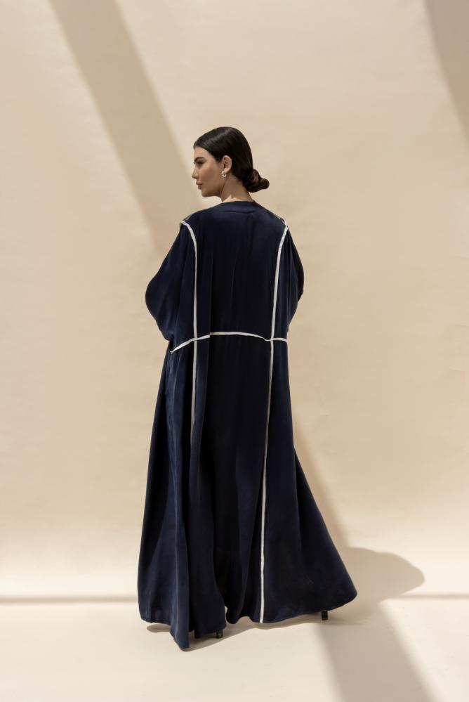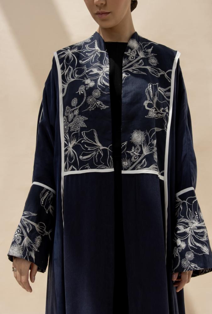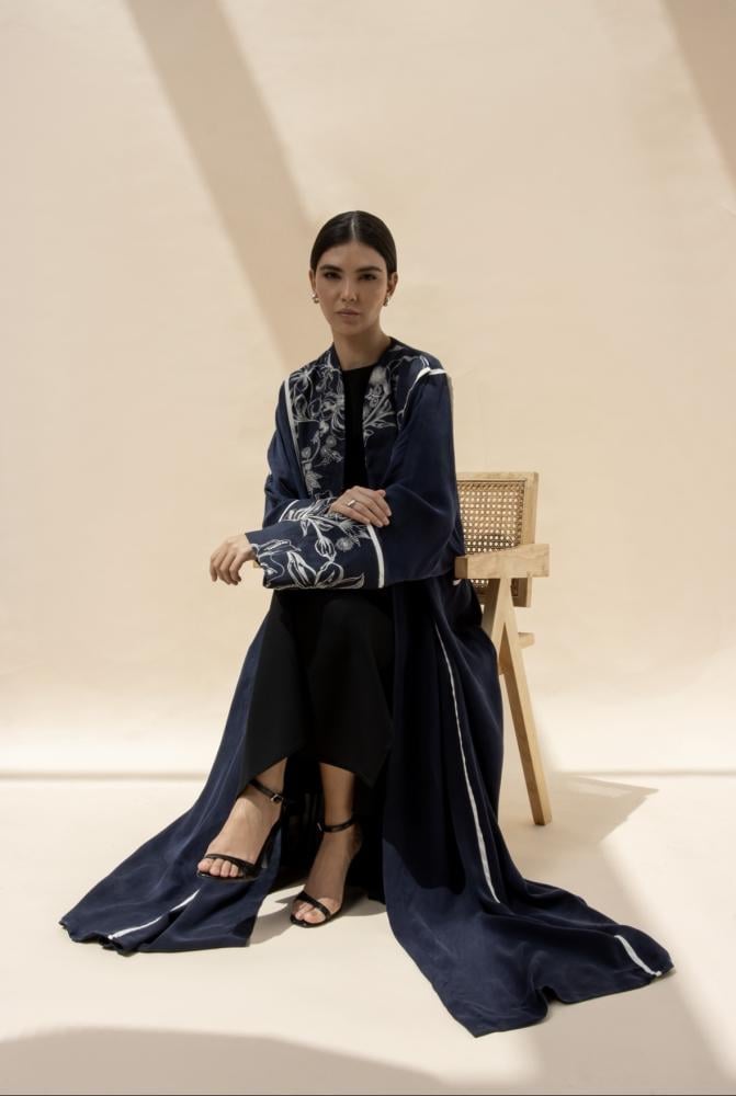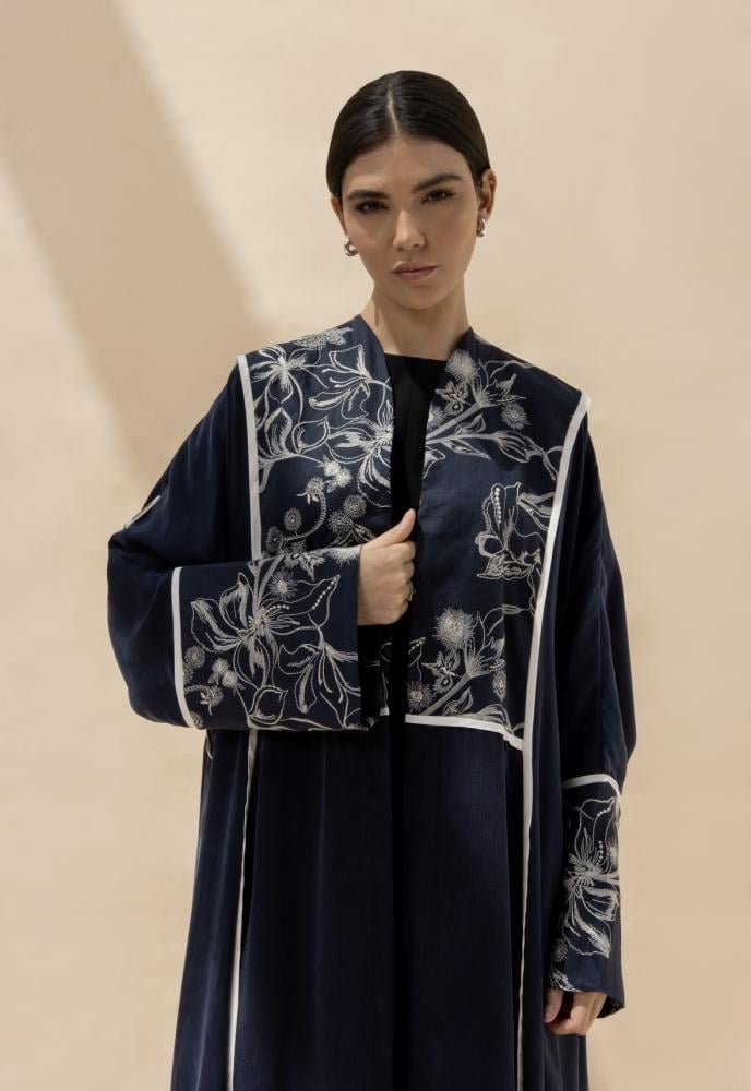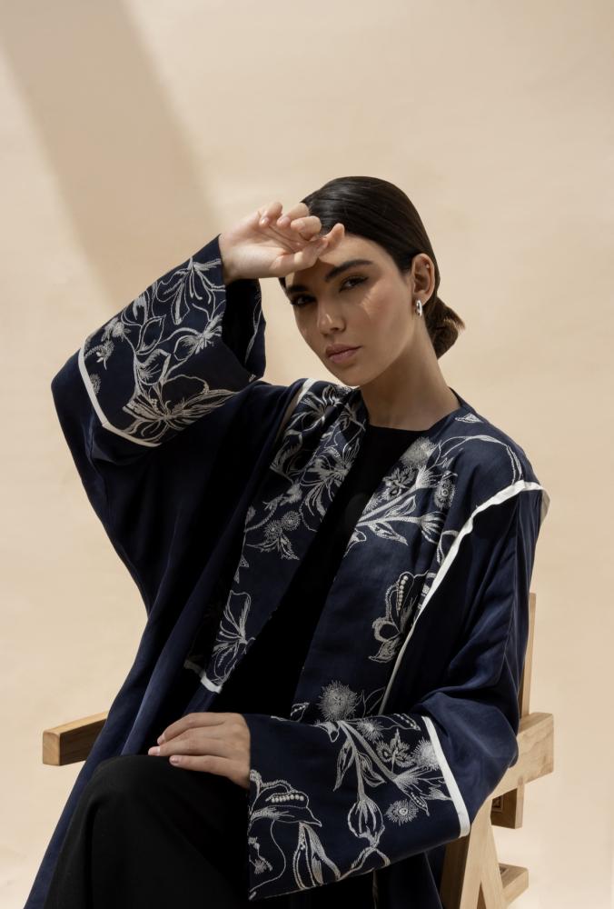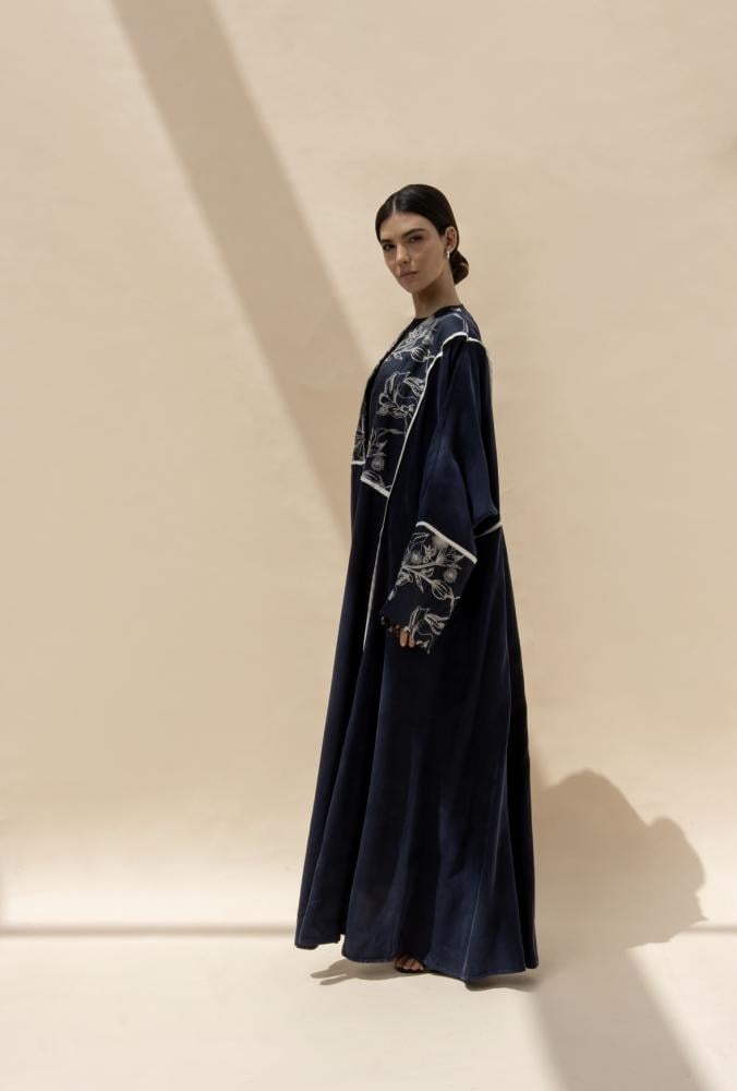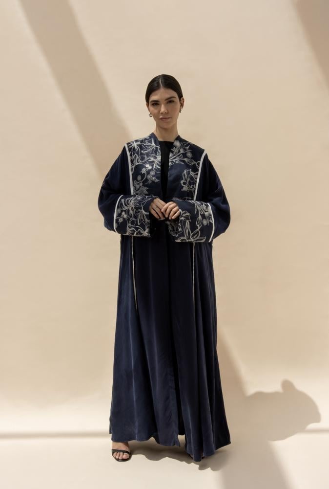 عباية من الحرير المغسول بقصّة واسعة وانسيابية تمنح راحة وأناقة في آنٍ واحد. مزيّنة بتفاصيل من قماش اللينن المطرز بالورد، يضفي لمسة أنثوية راقية على التصميم، مما يجعلها خياراً مثالياً للإطلالات الراقية والناعمة في المناسبات أو الخروجات اليومية..