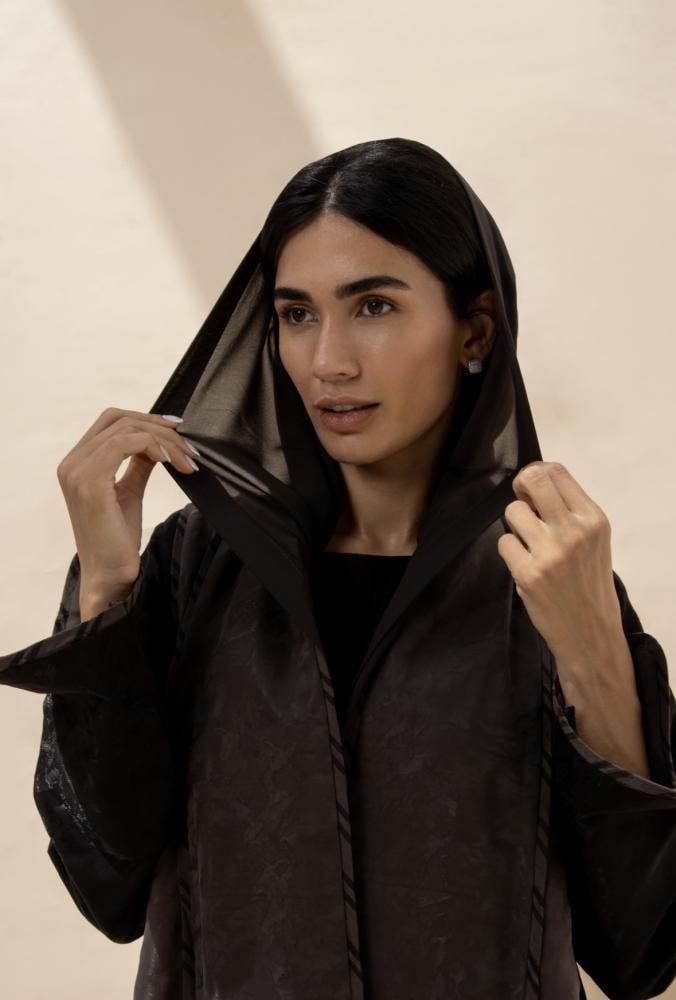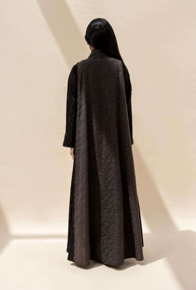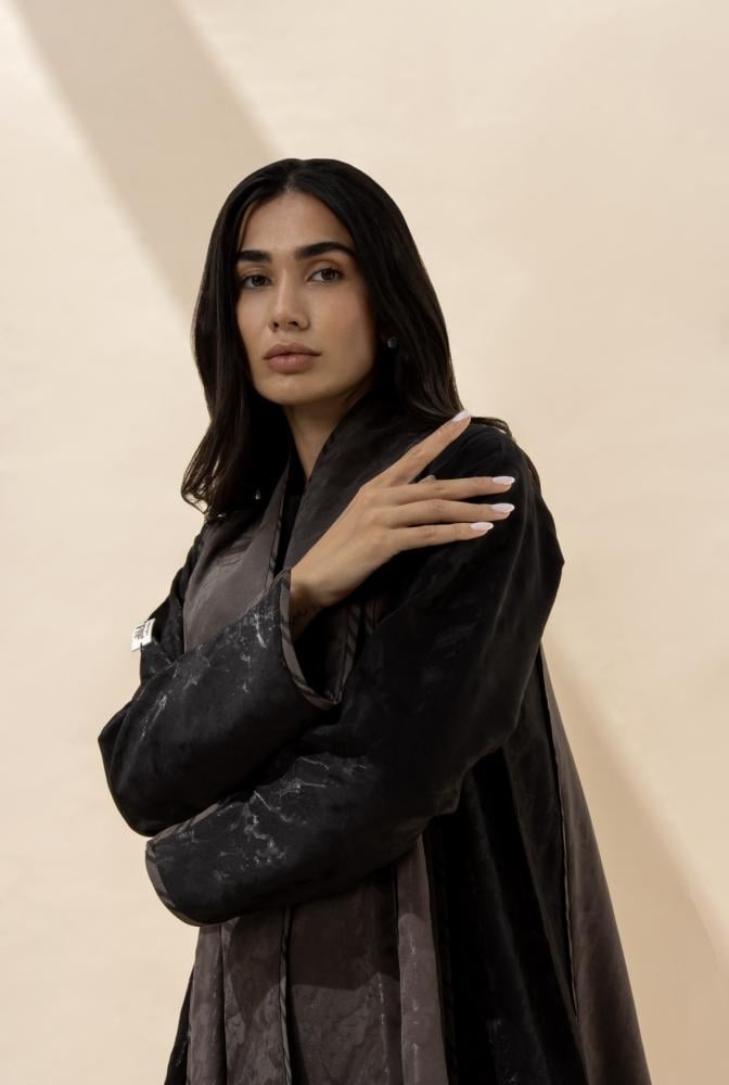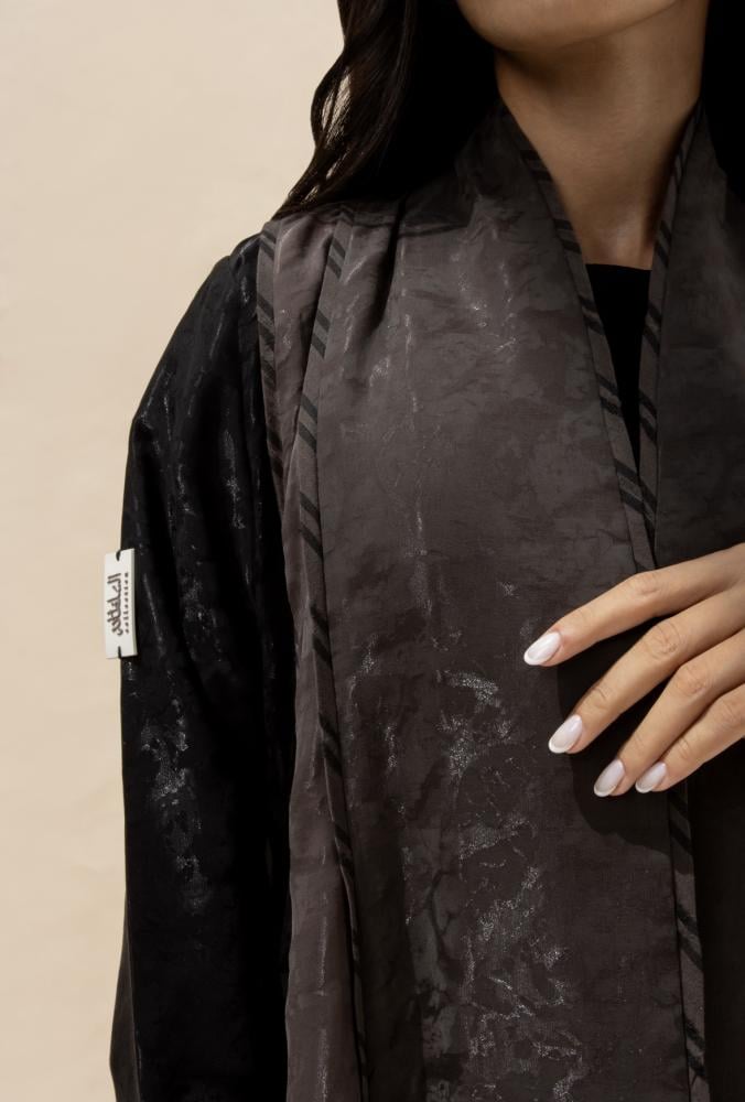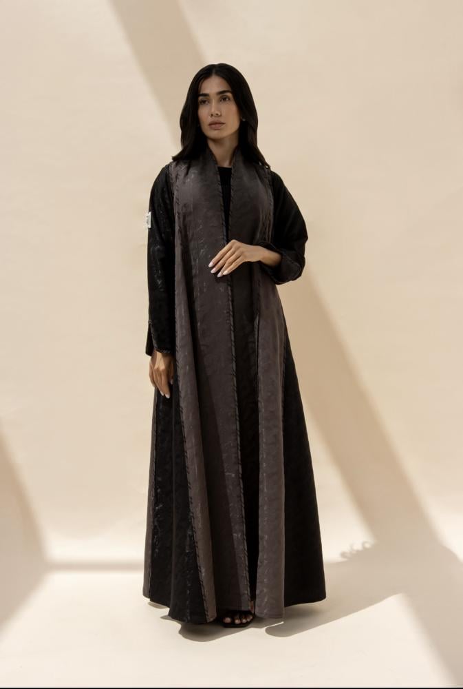 عباية من الحرير المغسول بتصميم كلوش واسع وانسيابي، تميّزت بتداخل أنيق بين درجات الزيتي والأسود في القصات، ما يضفي عليها طابع عصري وفخم. تجمع بين الراحة والرقي، وتناسب الذوق الهادئ والمميز لمحبات الألوان الغامقة والأنيقة..