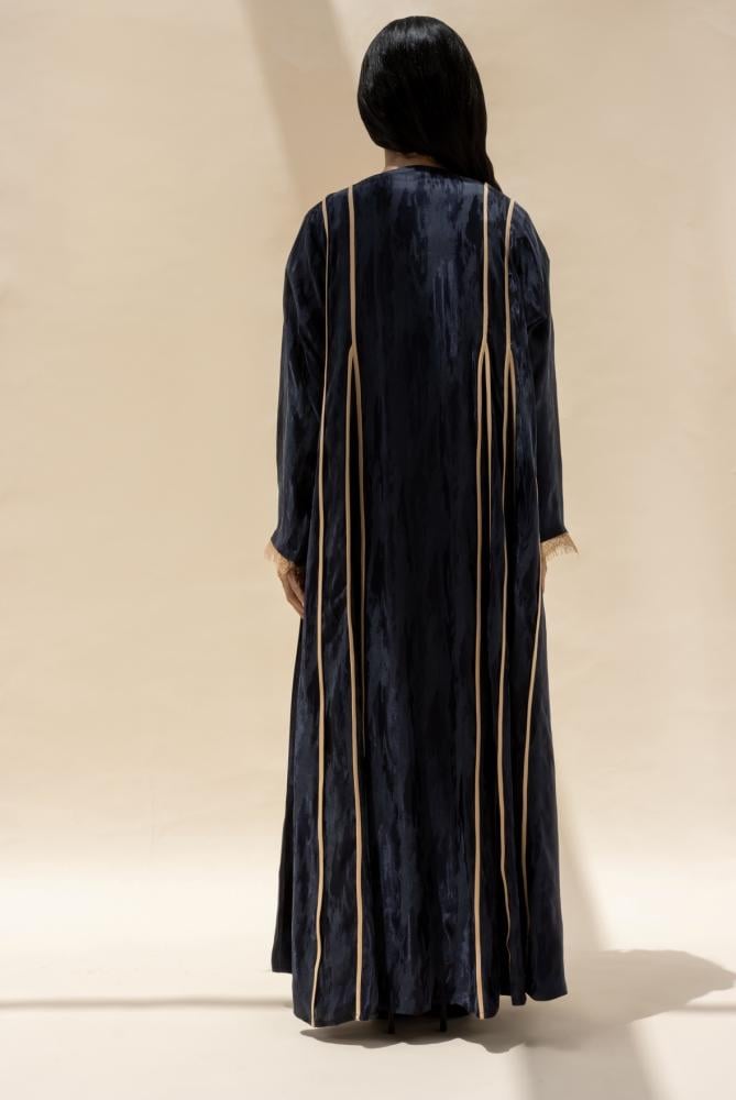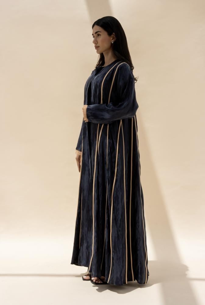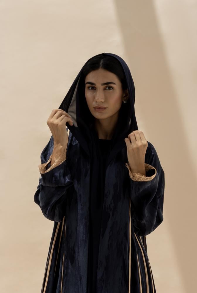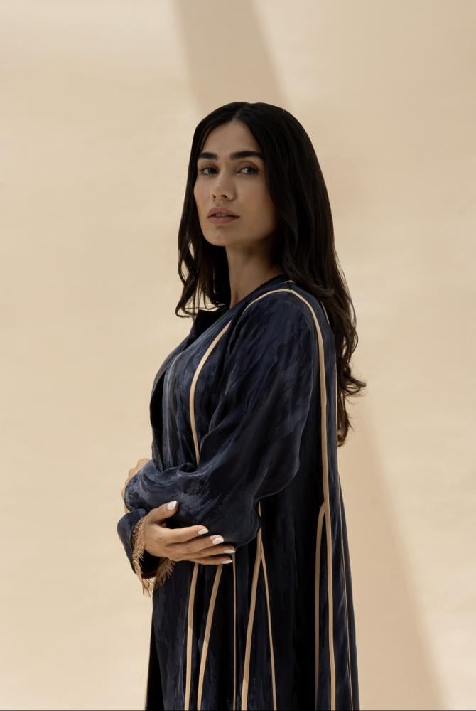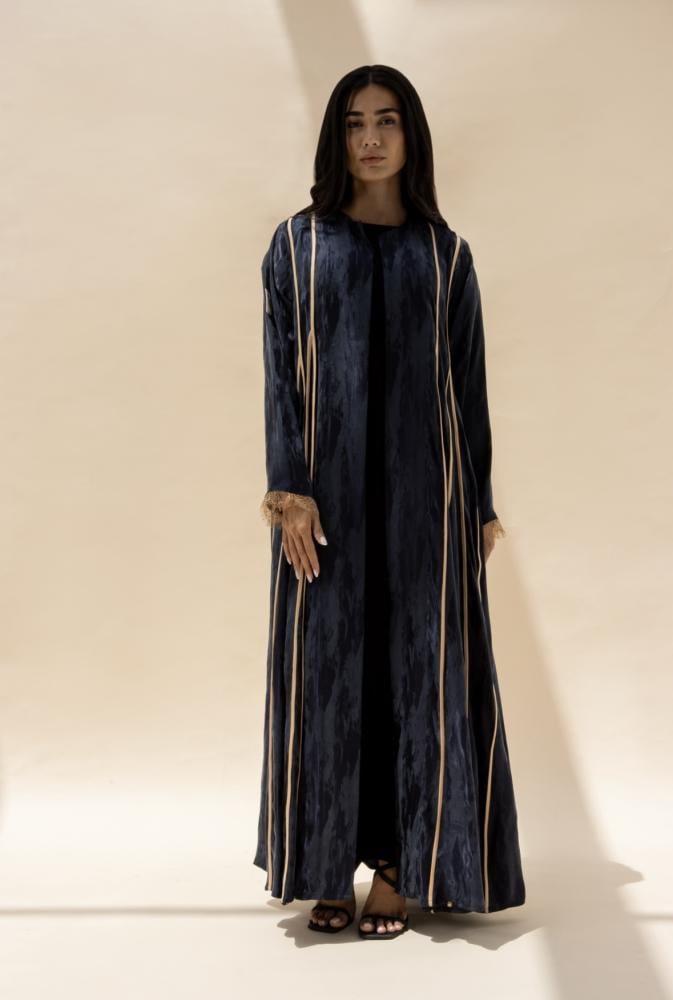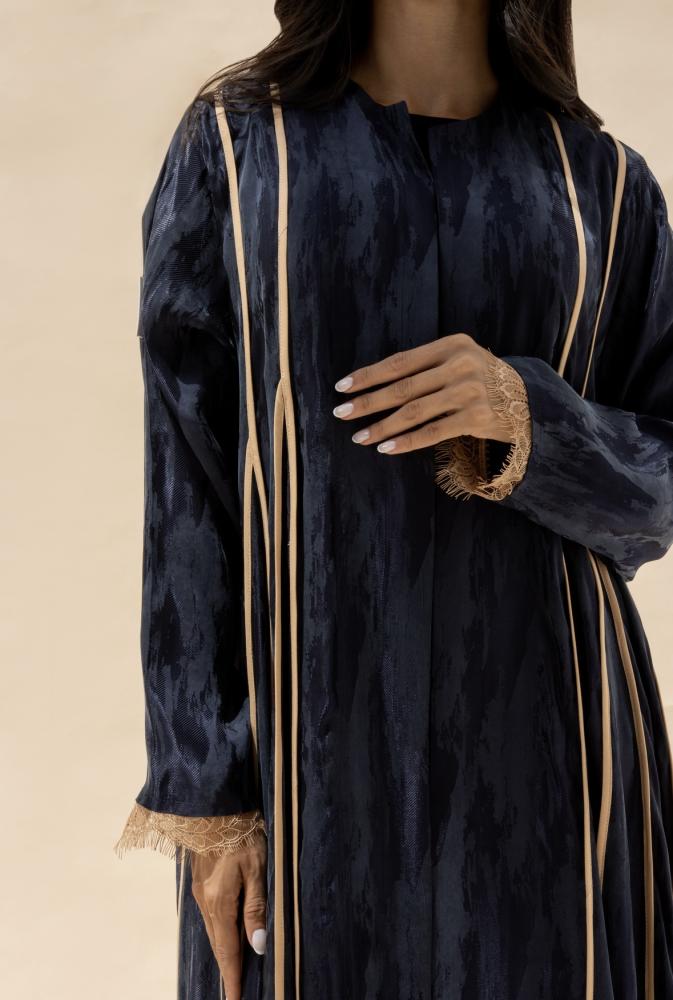 عباية أنيقة مصنوعة من الحرير المغسول. تأتي بتصميم كلوش واسع يمنح حرية في الحركة ولمسة راقية. الأكمام مزينة بالدانتيل الناعم، مما يضيف لمسة أنثوية أنيقة للتصميم. تناسب الإطلالات الفخمة والمناسبات،