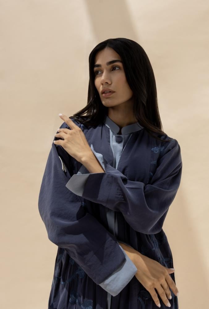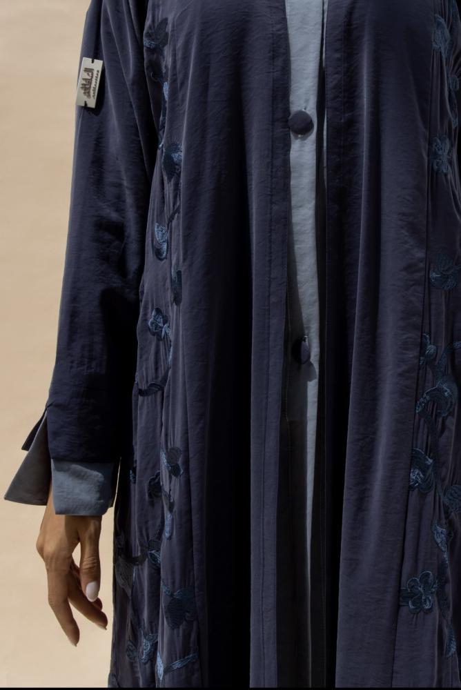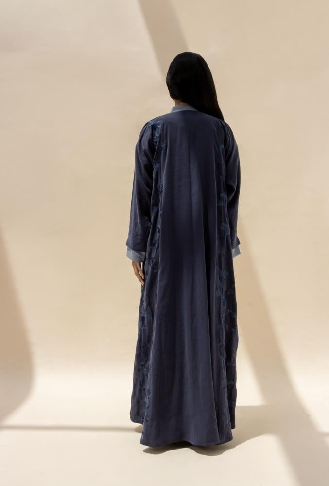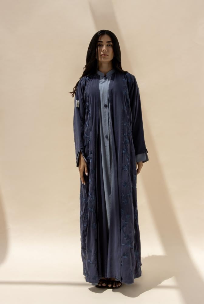 عباية حرير مغسول بتصميم أنيق وناعم، مغلقة من الأمام لمظهر محتشم وانسيابي. تتميز بتفاصيل تطريز ورد ناعم على الجانبين يضيف لمسة أنثوية راقية، مما يجعلها مثالية للمناسبات الخاصة أو الإطلالات اليومية الراقية.