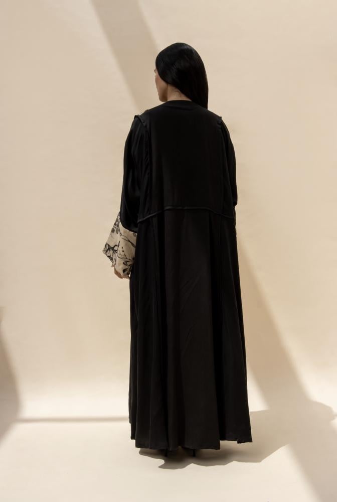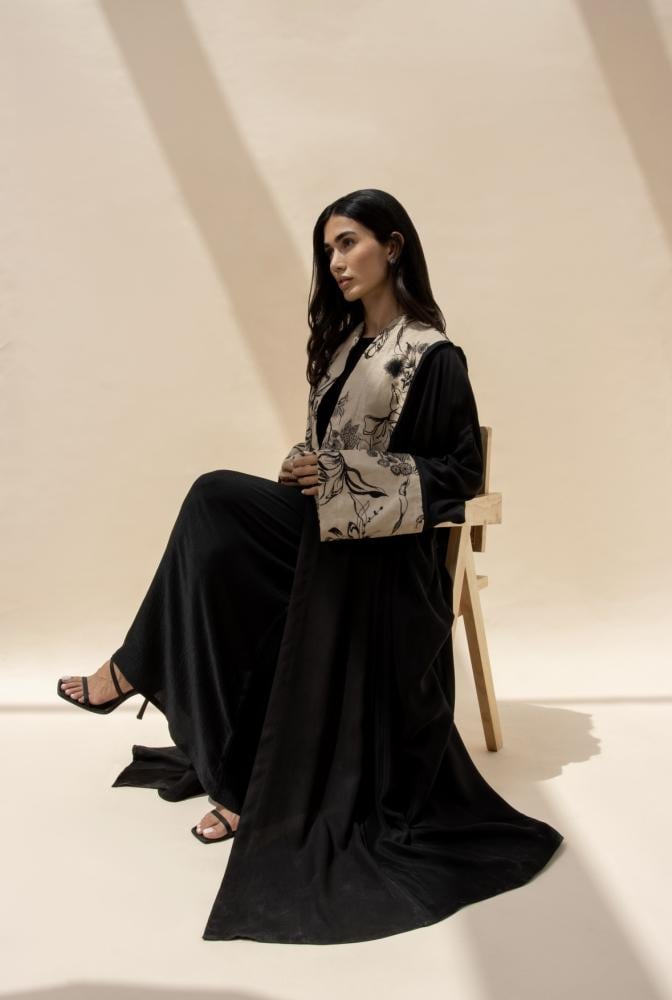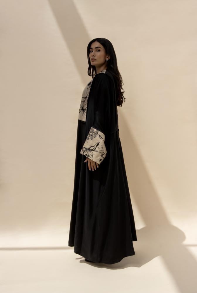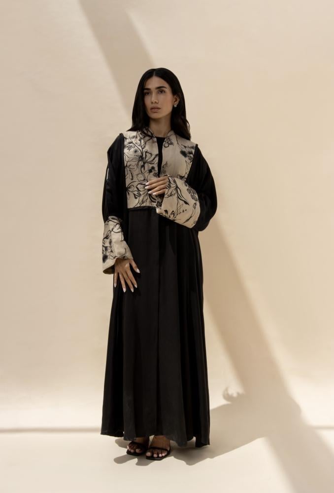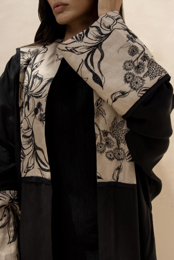 عباية من الحرير المغسول بقصّة واسعة وانسيابية تمنح راحة وأناقة في آنٍ واحد. مزيّنة بتفاصيل من قماش اللينن المطرز بالورد، يضفي لمسة أنثوية راقية على التصميم، مما يجعلها خياراً مثالياً للإطلالات الراقية والناعمة في المناسبات أو الخروجات اليومية..