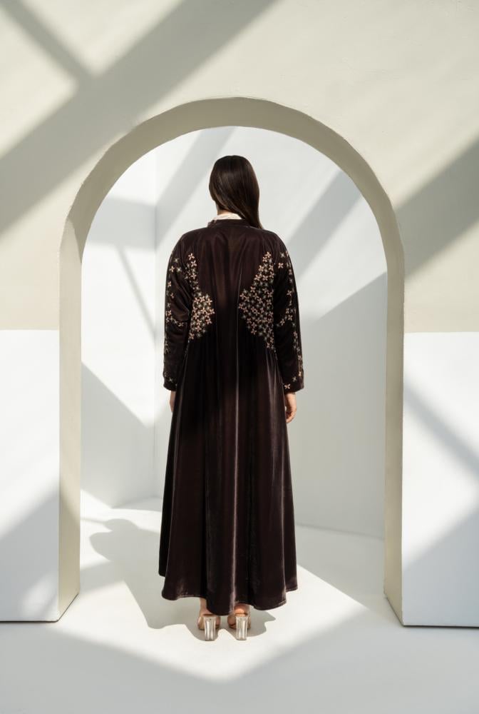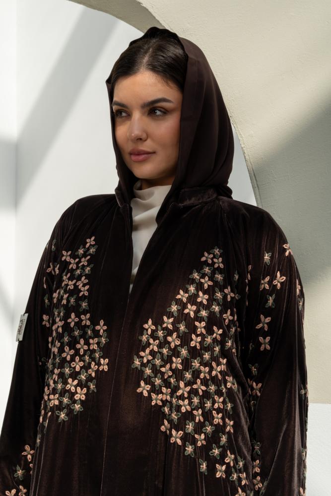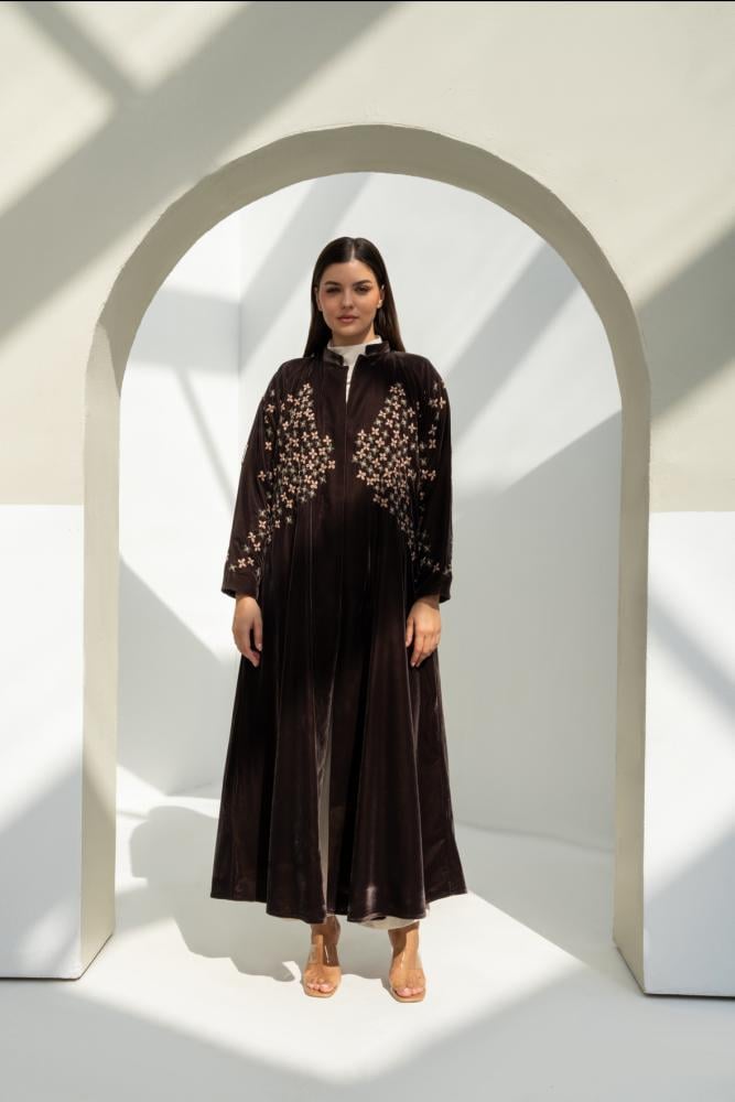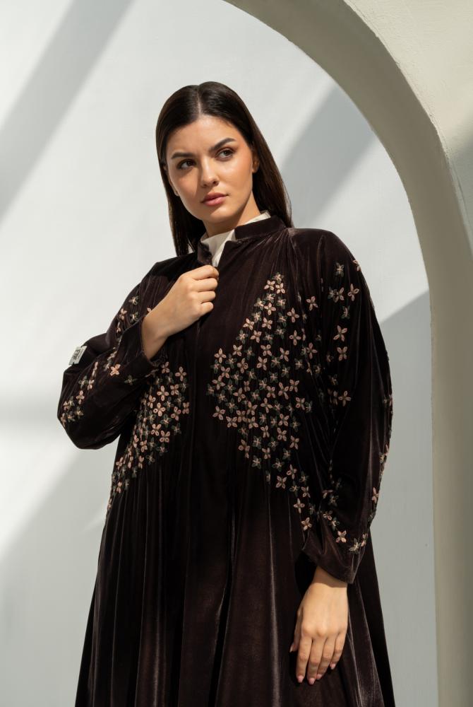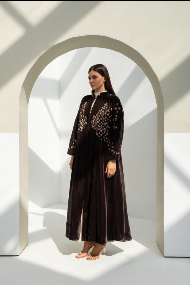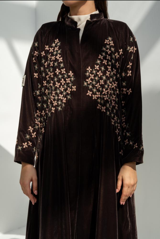 عباية مخمل فاخرة مزينة بتطريز يدوي كامل بتفاصيل دقيقة تبرز جمال القطعة وتمنحها طابعًا مميزًا وفخمًا. مبطّنة بقماش كريب ناعم لراحة أكبر وانسيابية جميلة أثناء اللبس.