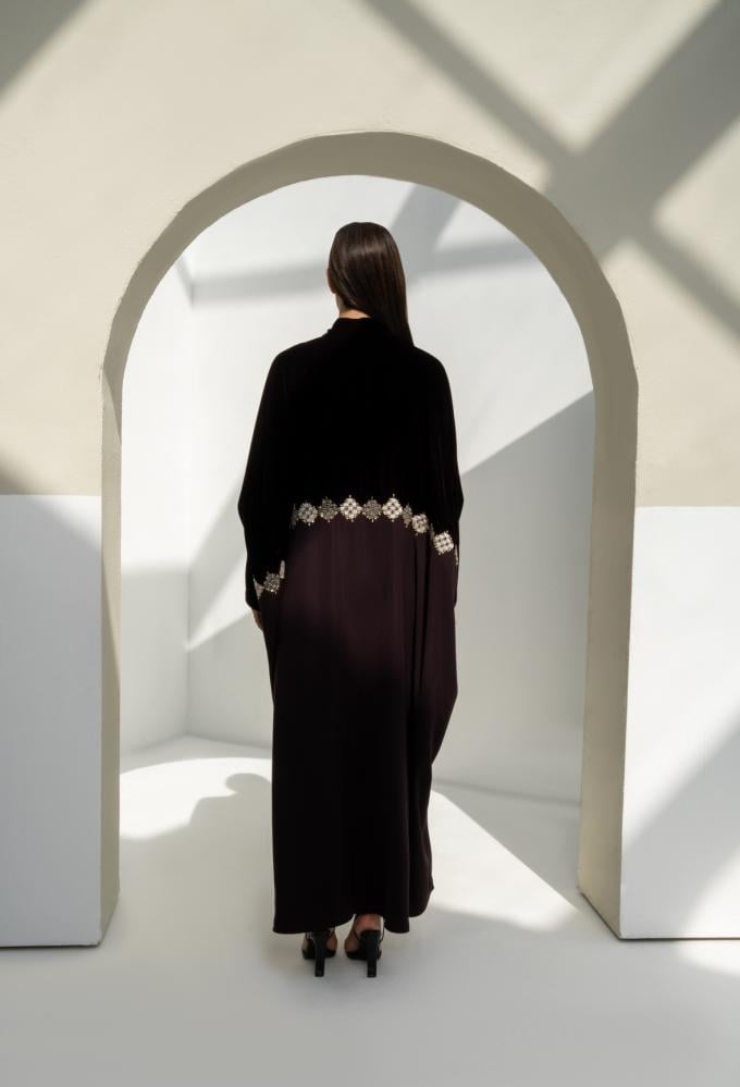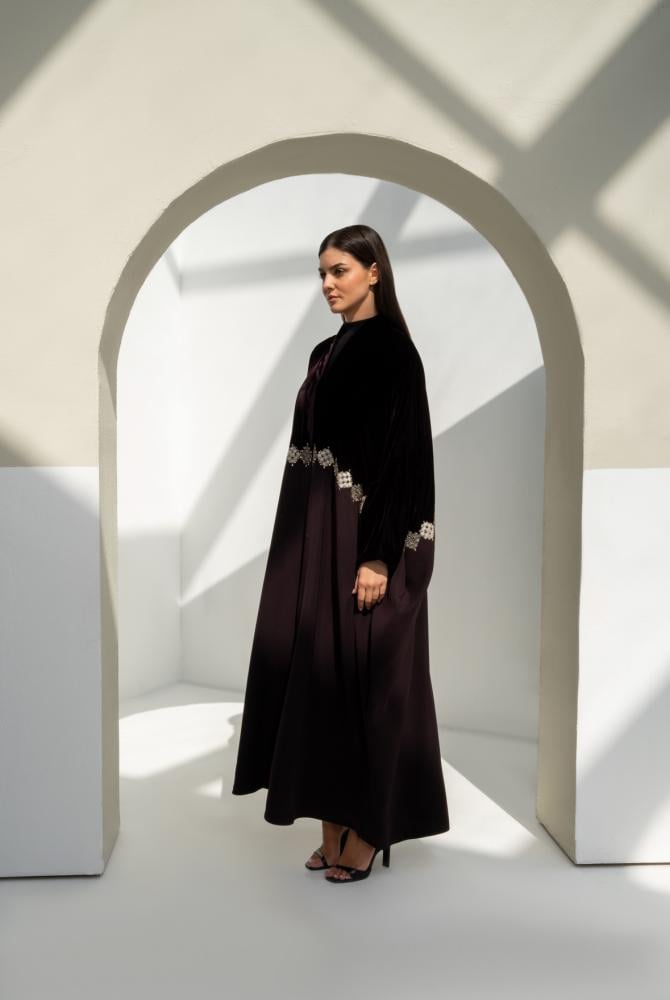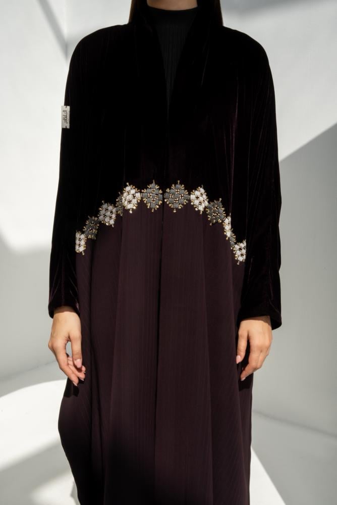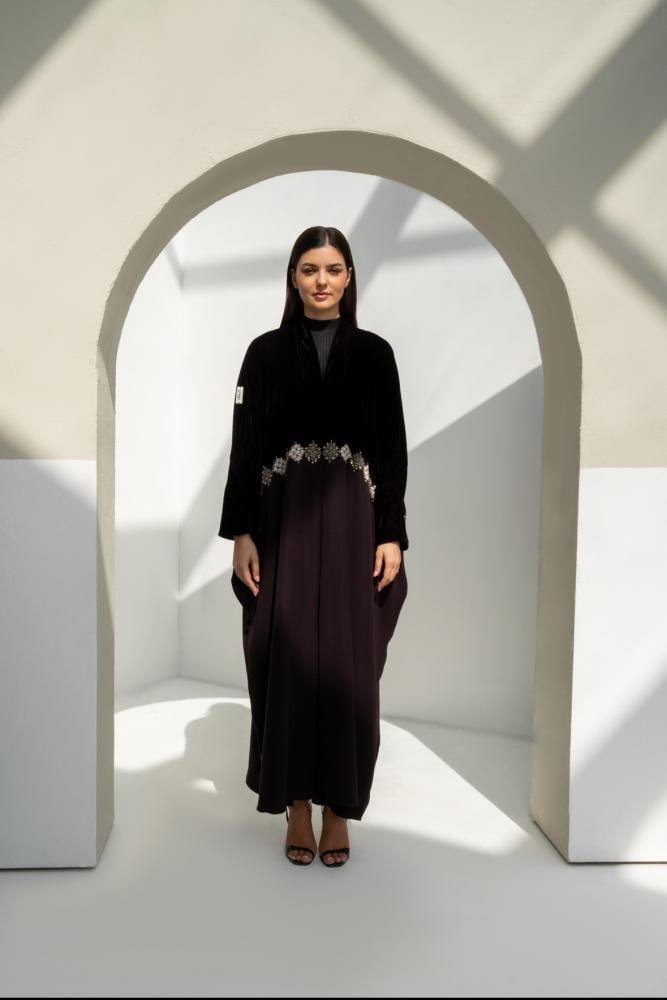 عباية مخمل فاخرة يكتمل جمالها بقماش كريب مخطط بتخطيطه ناعمة، بتصميم واسع وانسيابي يجمع بين اللمعة الراقية والراحة في اللبس. قطعة أنيقة ومناسبة للمناسبات بإطلالة فخمة وبسيطة في نفس الوقت..