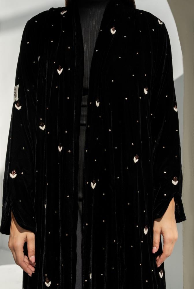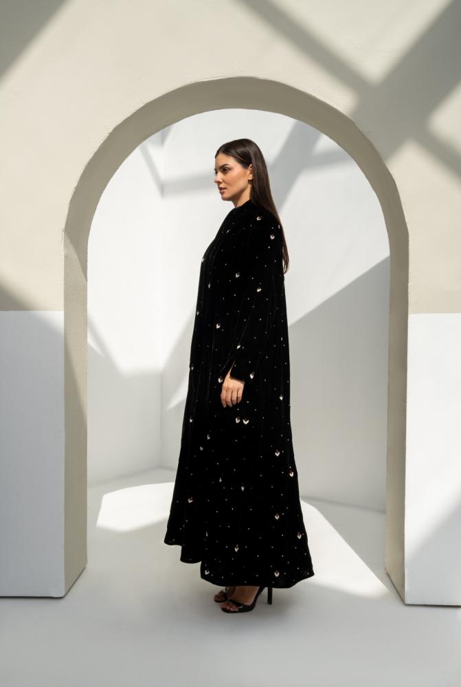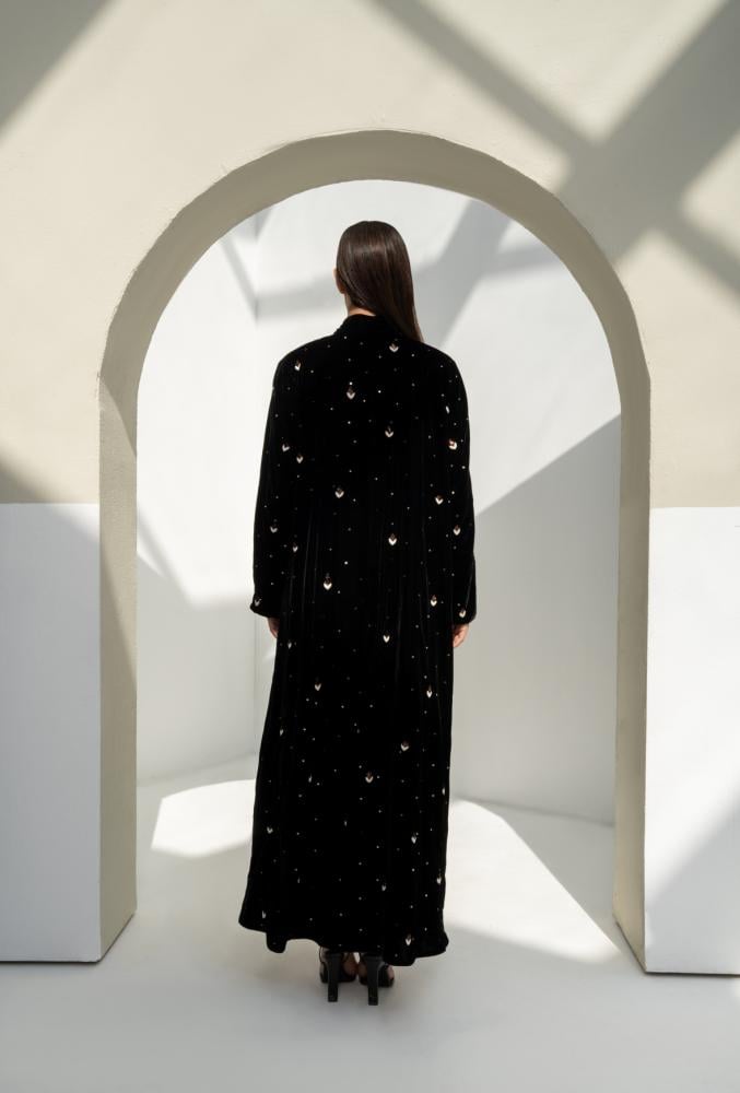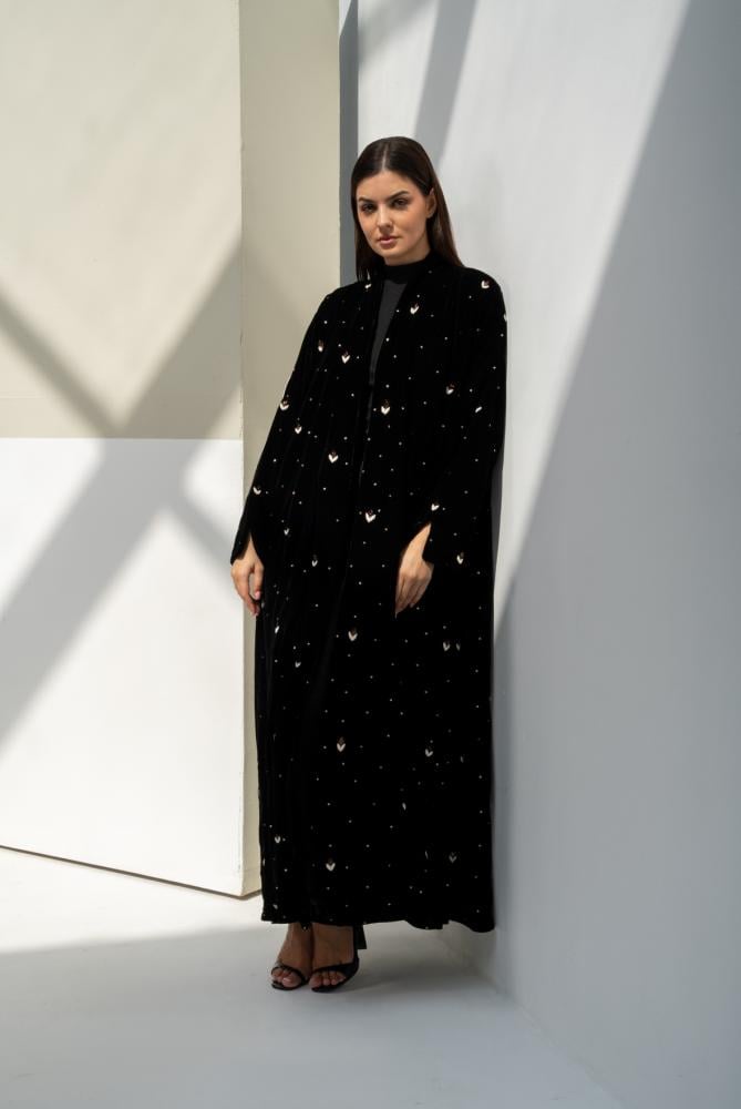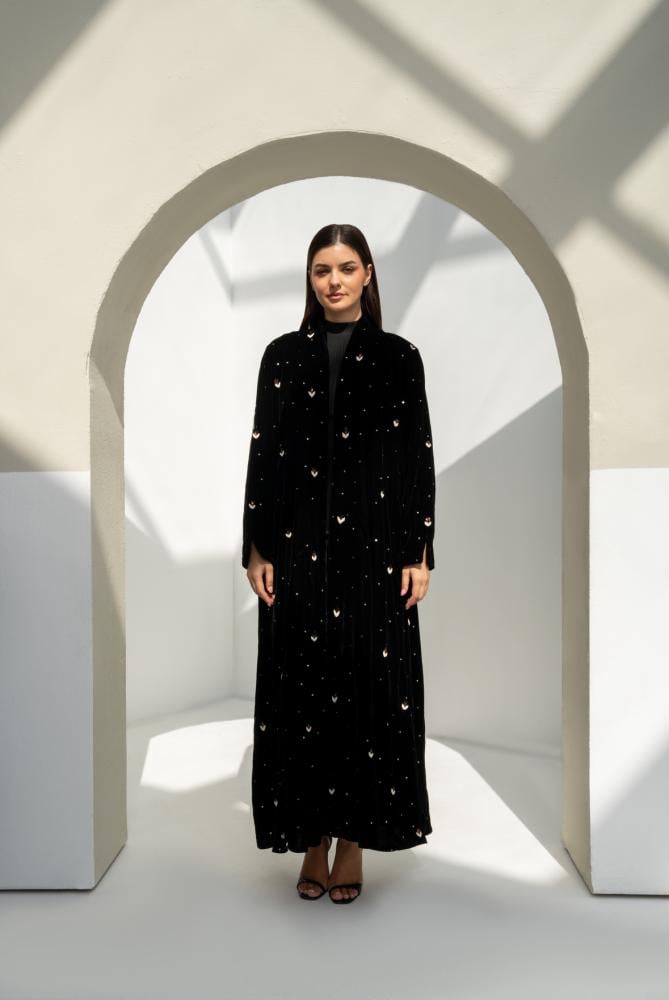 عباية مخمل فاخرة مزينة بشك كامل يمنحها بريق هادئ يناسب كل المناسبات الراقية. مصممة بقصّة واسعة وانسيابية تعزز جمال المخمل وتمنحك أناقة مريحة. مبطّنة بقماش كريب ليعطي ثبات وشكل أجمل أثناء اللبس.