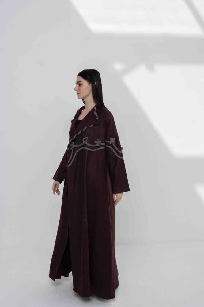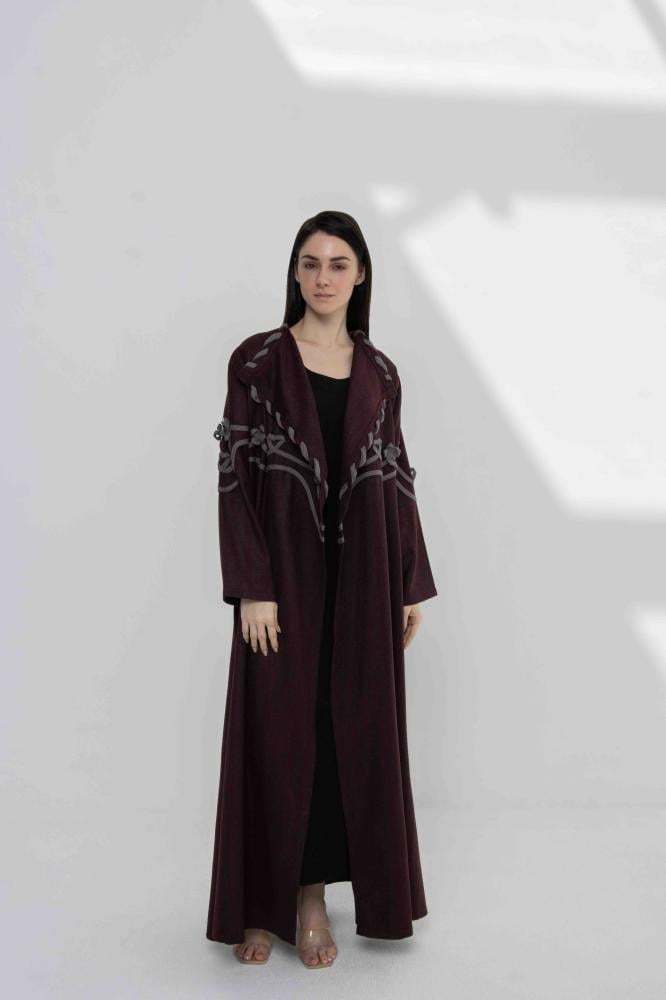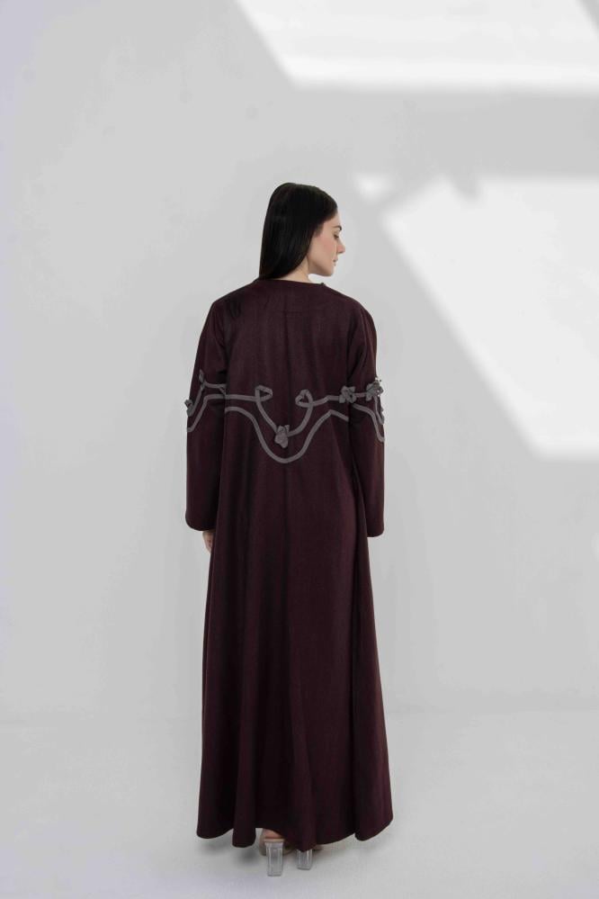 عباية مصنوعة من الصوف الهندي الطبيعي بتصميم مريح وأنيق، مزينة بتفاصيل بسيطة تضفي لمسة جمالية، ومثالية لأجواء الشتاء الباردة.