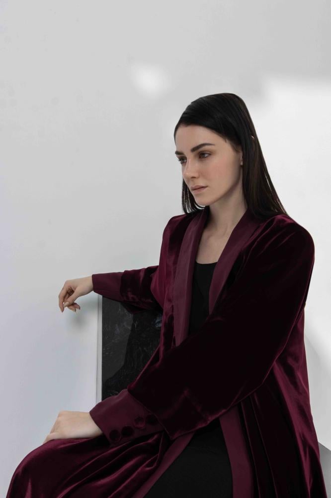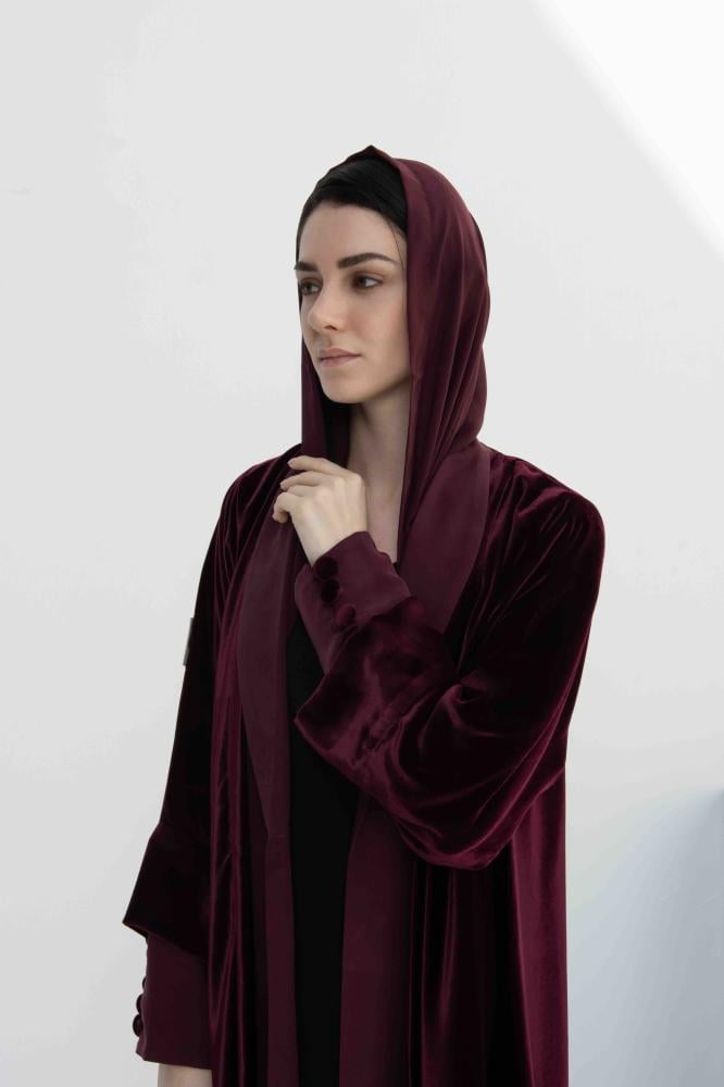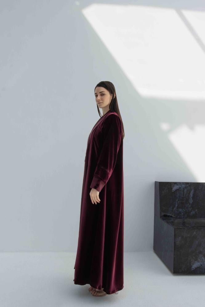 عباية أنيقة من المخمل الفاخر والحرير المغسول، بتصميم عملي مغلق بأزرار من الأمام، مثالية للاستخدام اليومي بإطلالة راقية ومريحة.