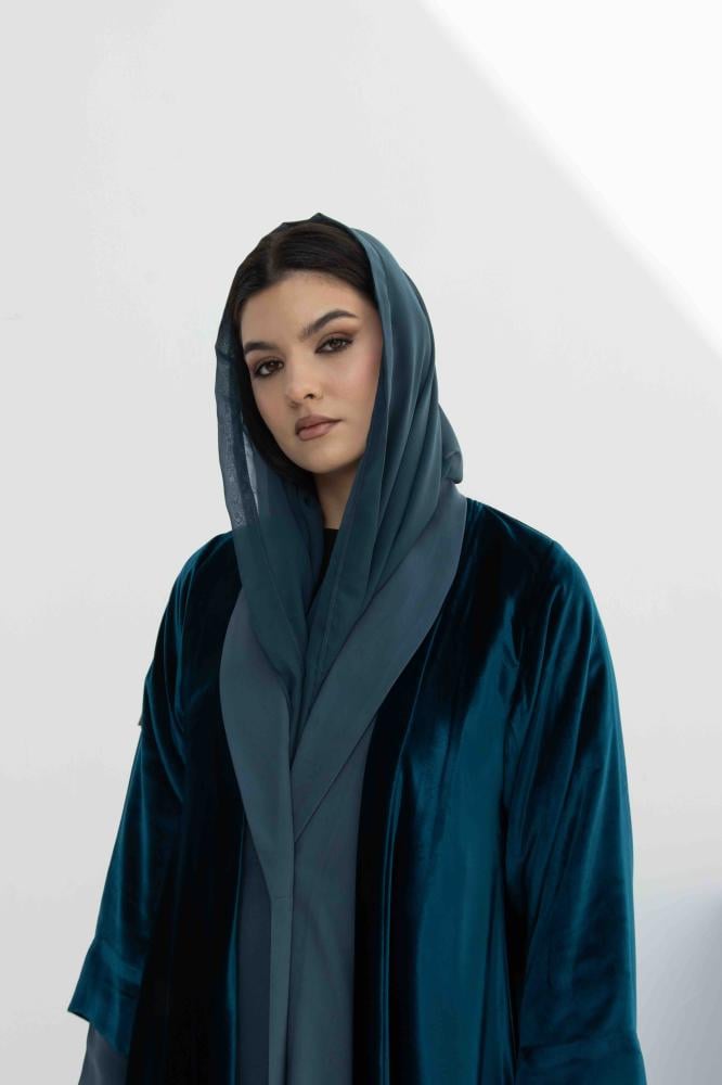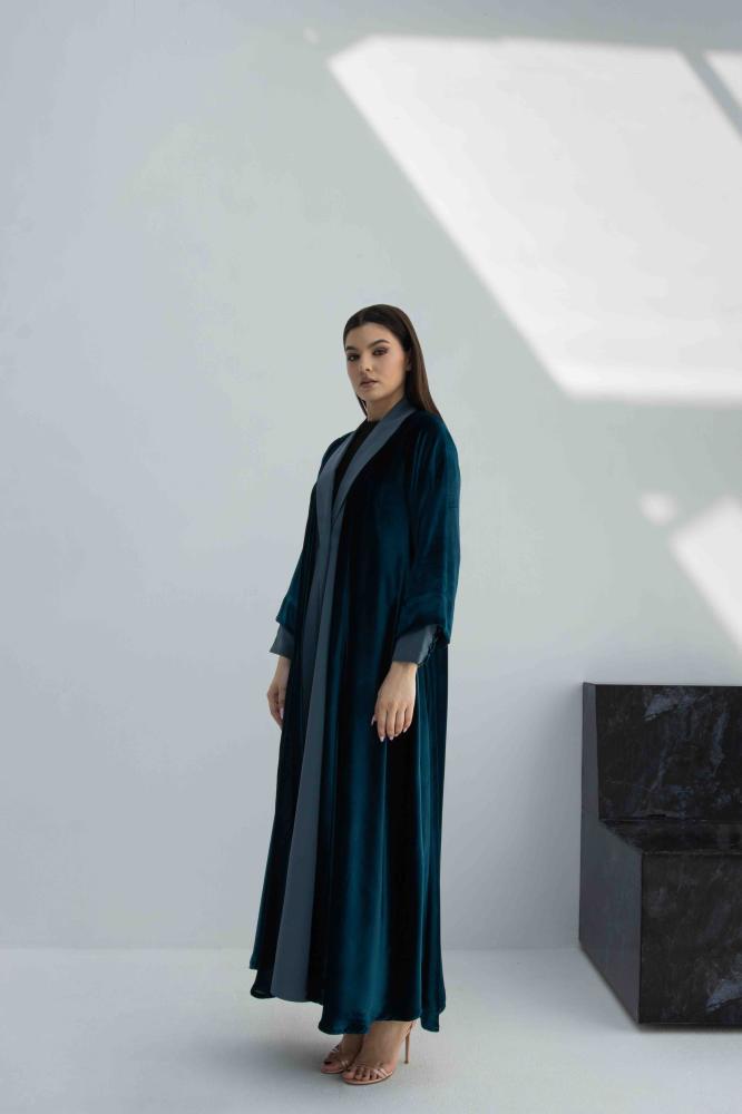 عباية أنيقة من المخمل الفاخر والحرير المغسول، بتصميم عملي مغلق بأزرار من الأمام، مثالية للاستخدام اليومي بإطلالة راقية ومريحة.