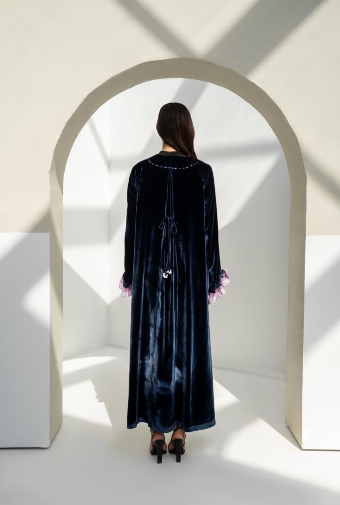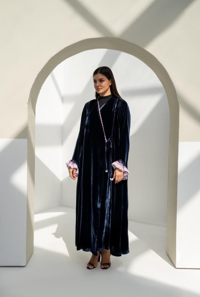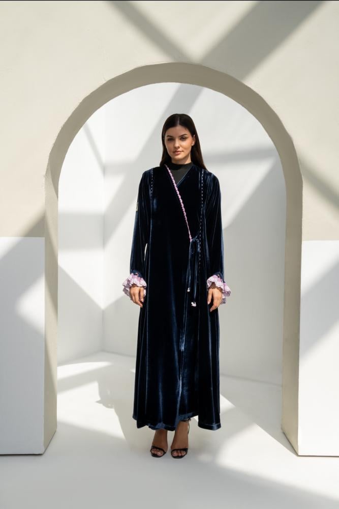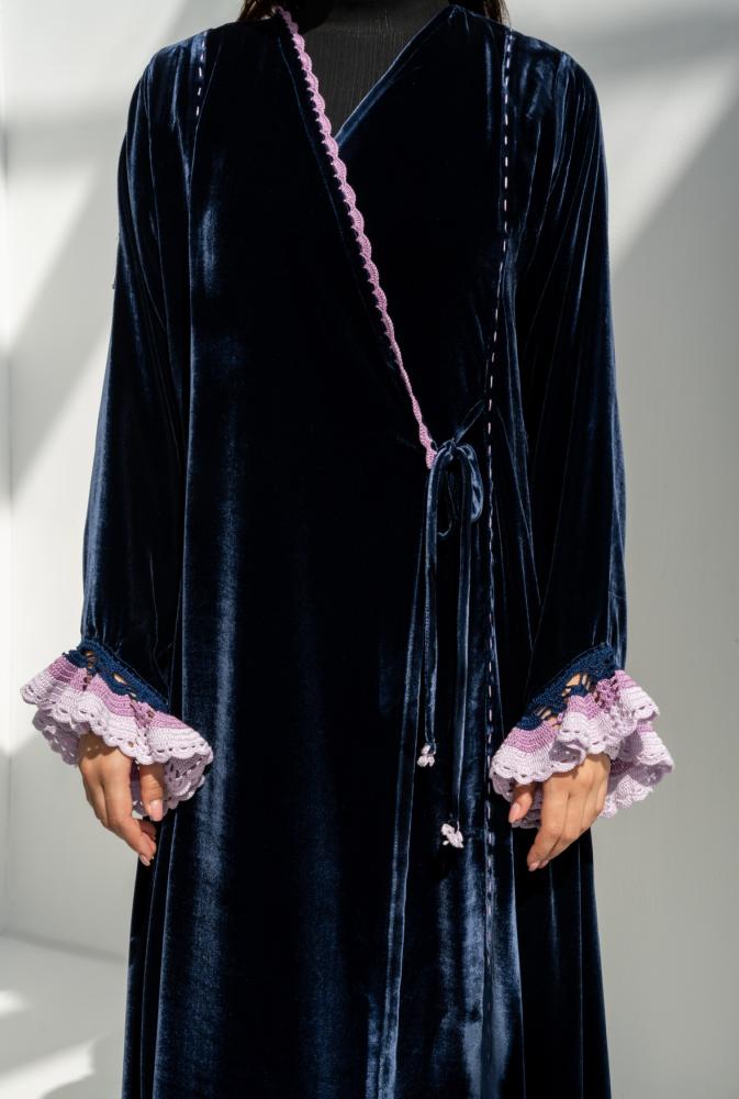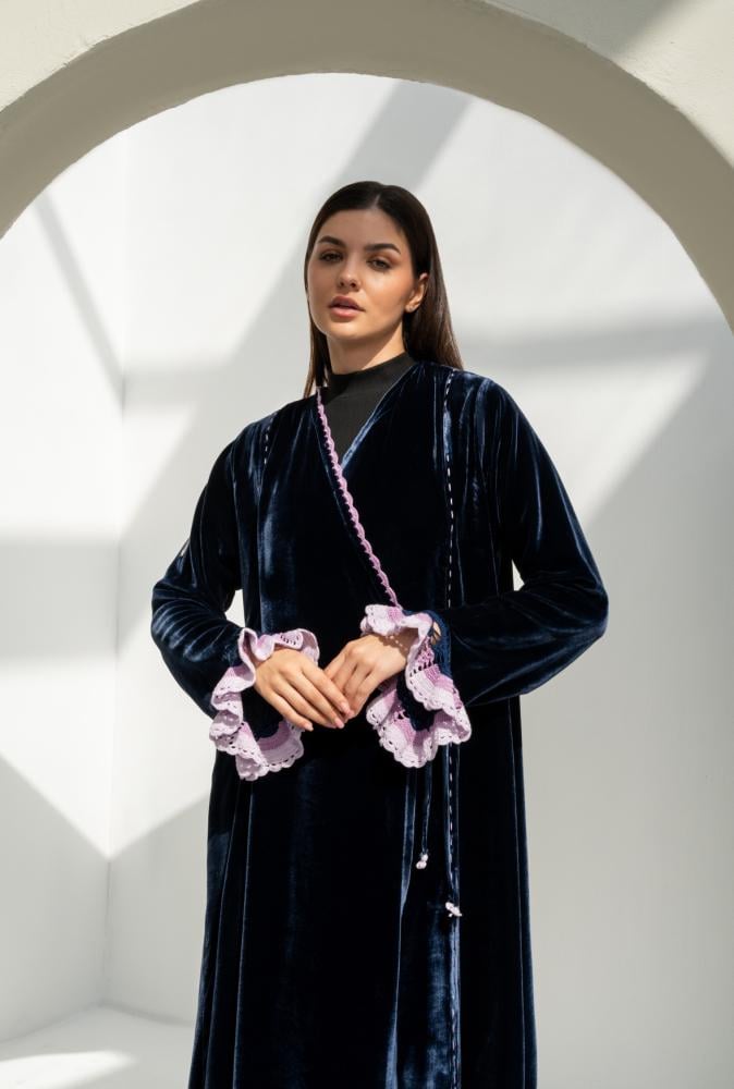 عباية مخمل فاخرة بلمسات كروشيه يدوية على الأكمام، تمنحك مزيج راقٍ من النعومة والفخامة. تصميم انسيابي يعكس جمال الخامة ولمعة المخمل الشتوية مع تفاصيل كروشيه ناعمة تضيف لمسة أنثوية مميزة. اختيار مثالي للظهور بإطلالة دافئة، أنيقة، وملفتة بكل بساطة..