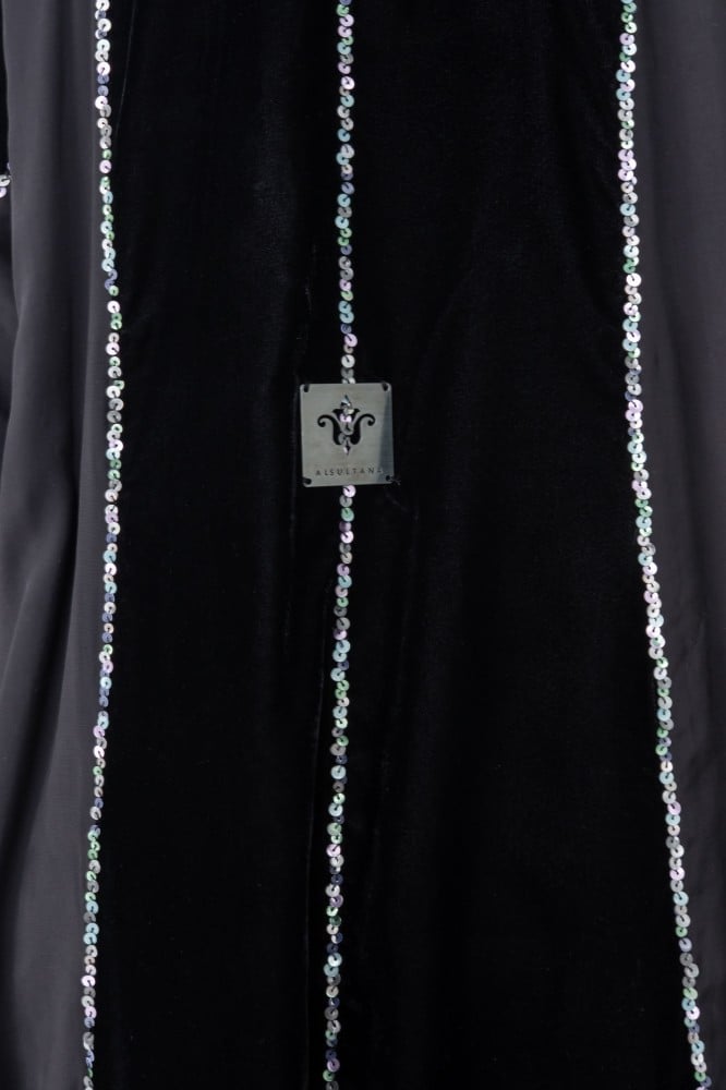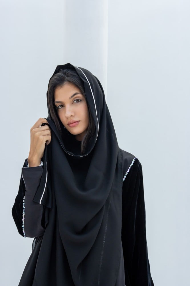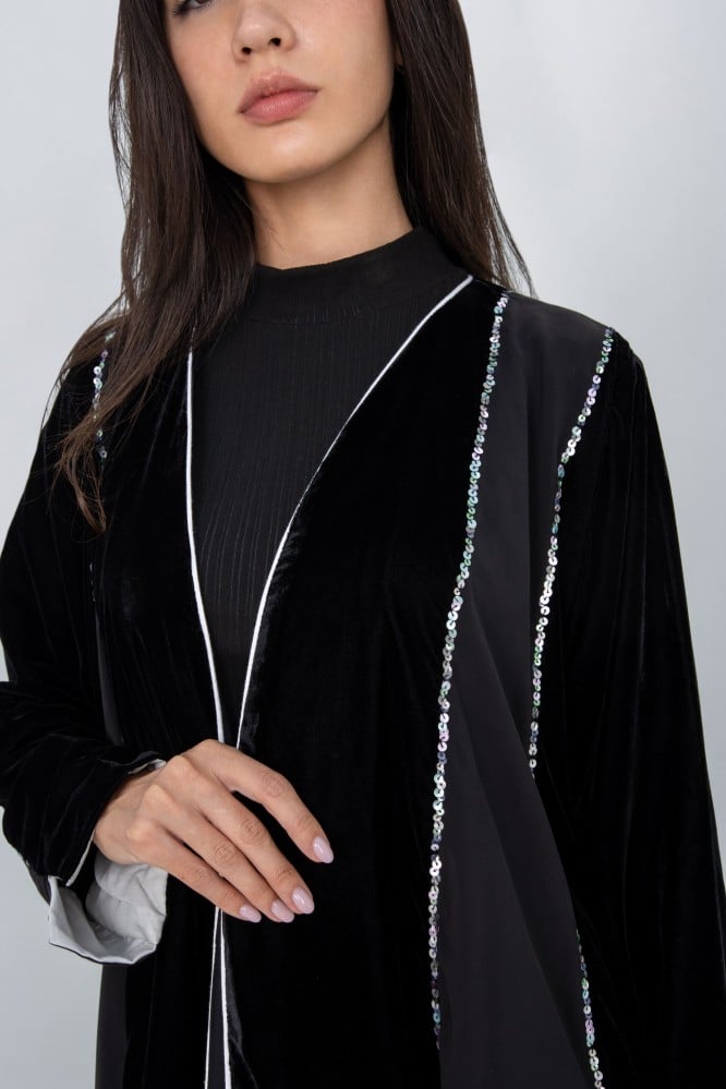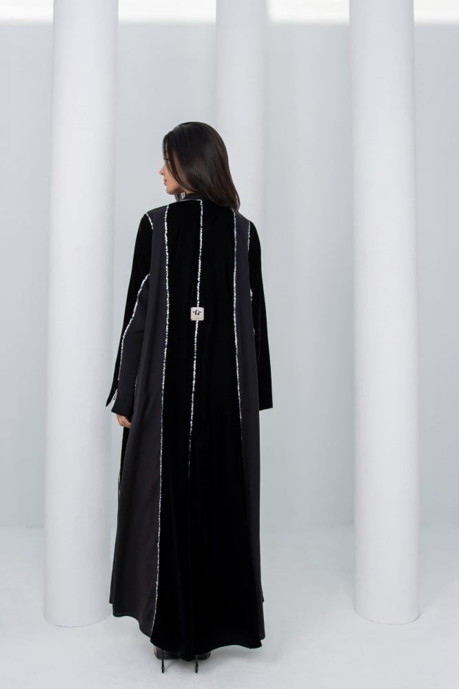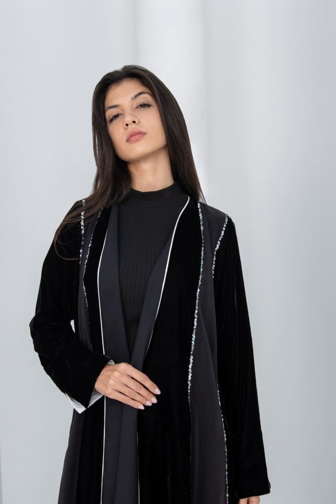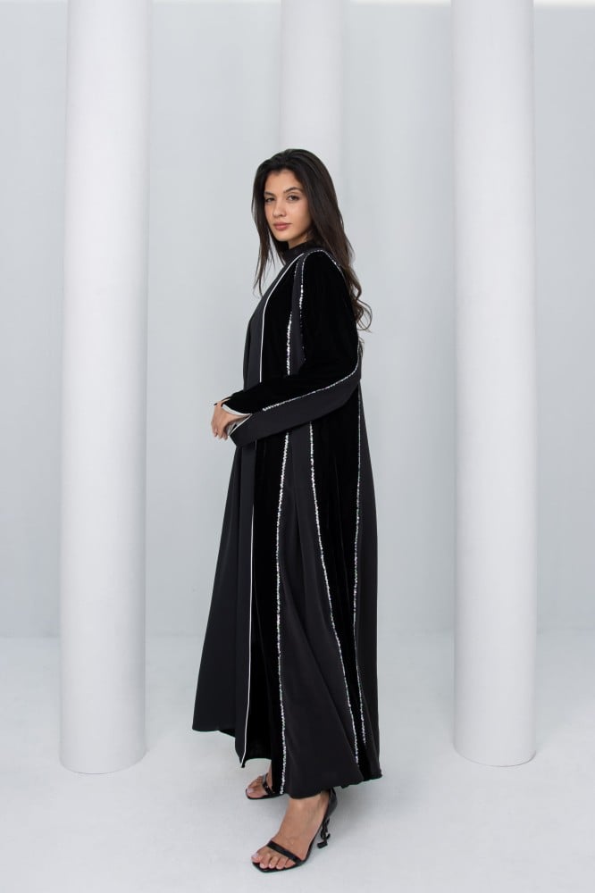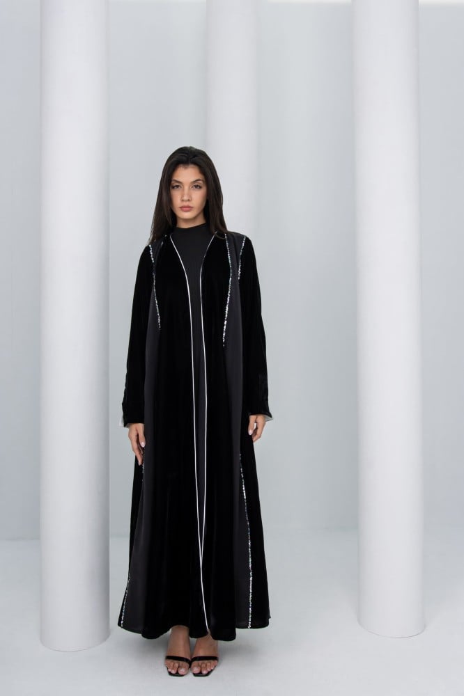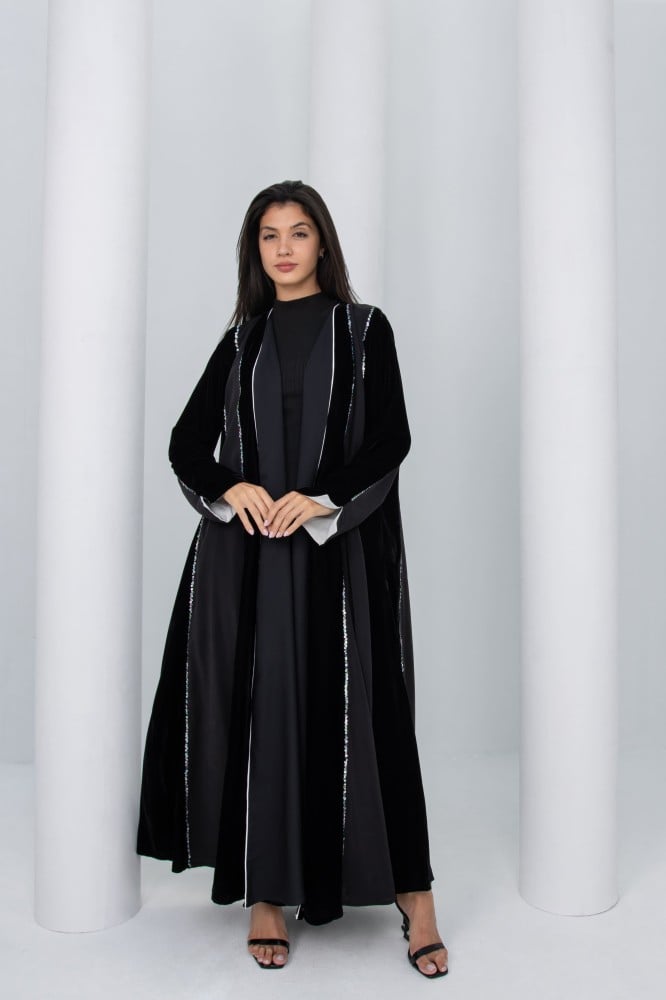 "عبايه مخمل سوداء تتميز بقصات من الحرير المغسول الكوري و التطريز اليدوي تجمع بين الأناقة و الجمال.."