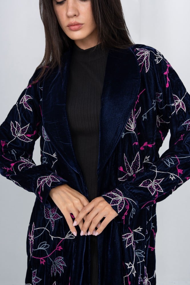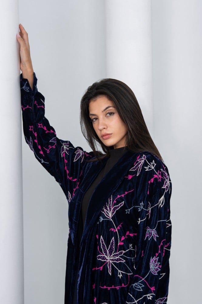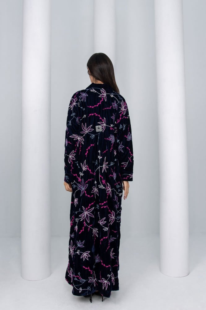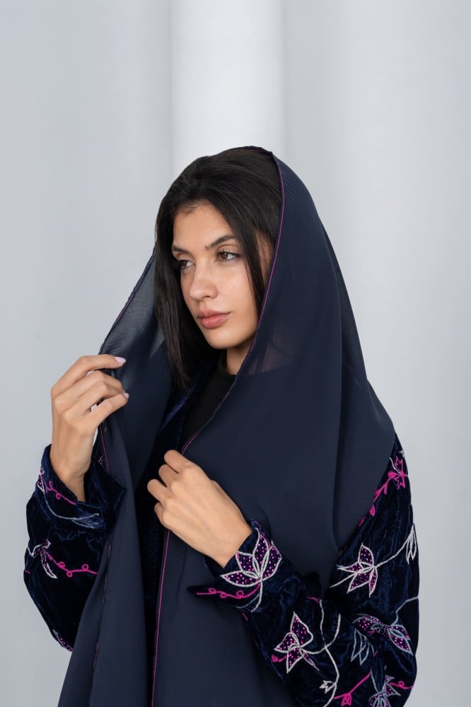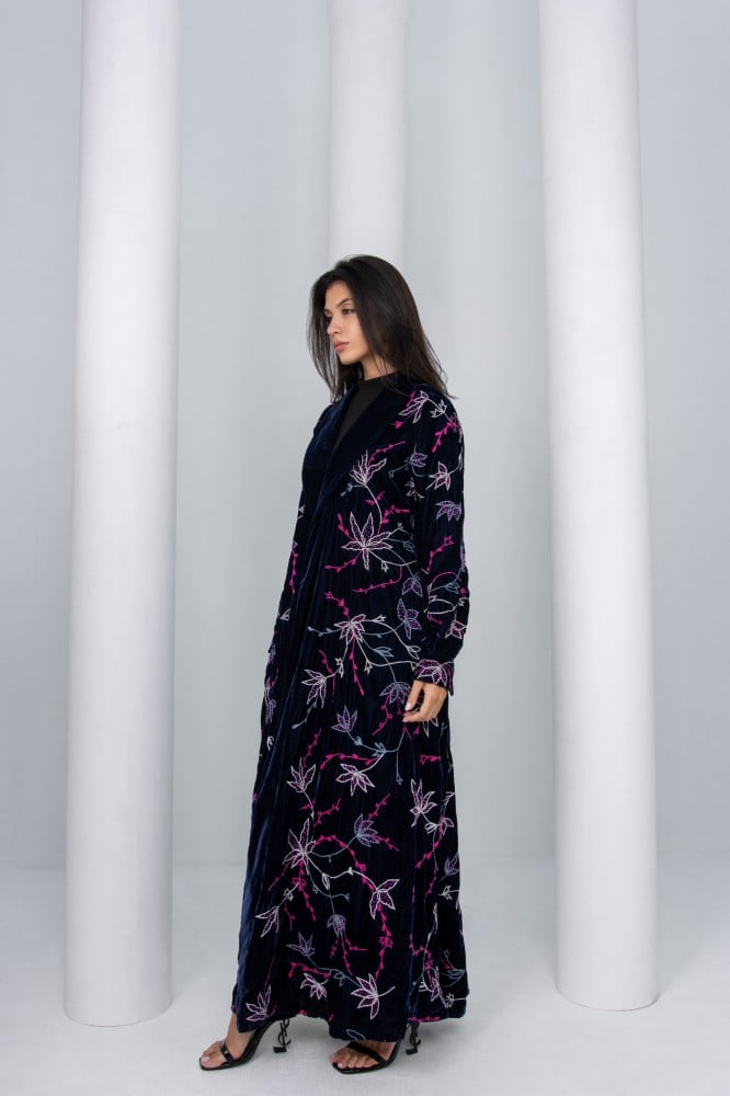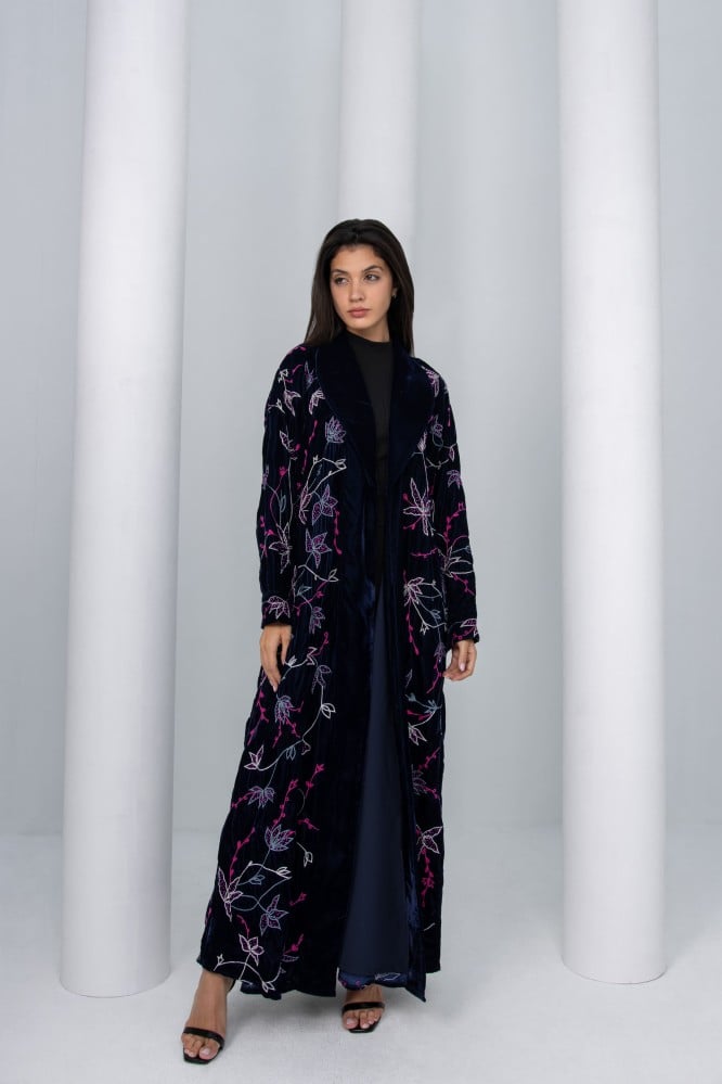 “تتميز العبايه بتفاصيل جريئة مزخرفة تضيف لمسه متألقة على قماش المخمل الفرنسي..”
