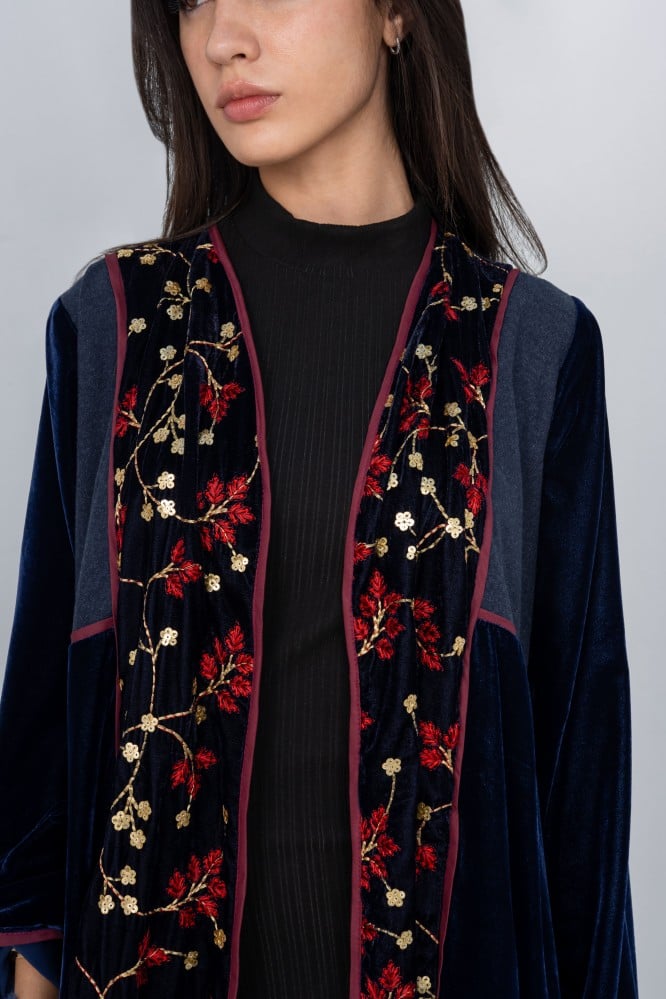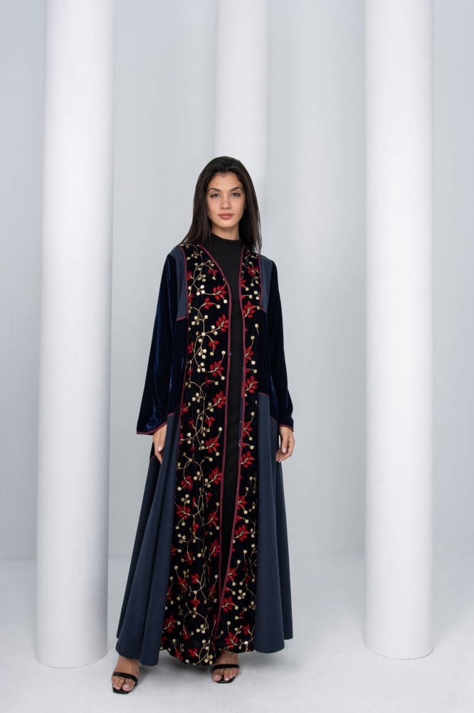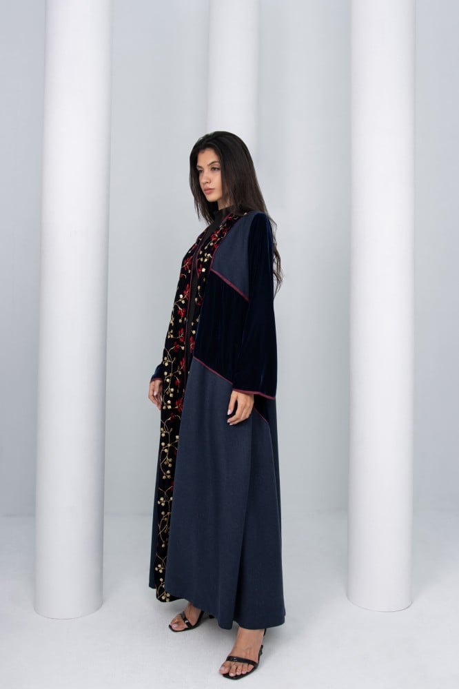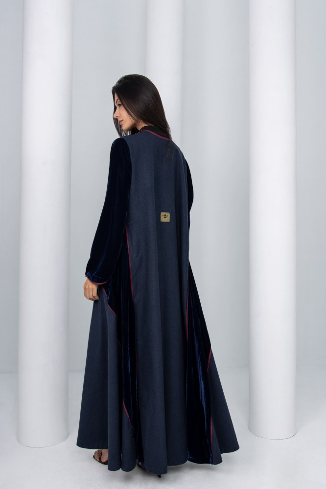 “عبايه شتويه تتميز بالتفاصيل، تجمع بين الجوخ الطبيعي و المخمل.. تجمع بين الانسيابية و الأناقة و اللمسة العصرية..”